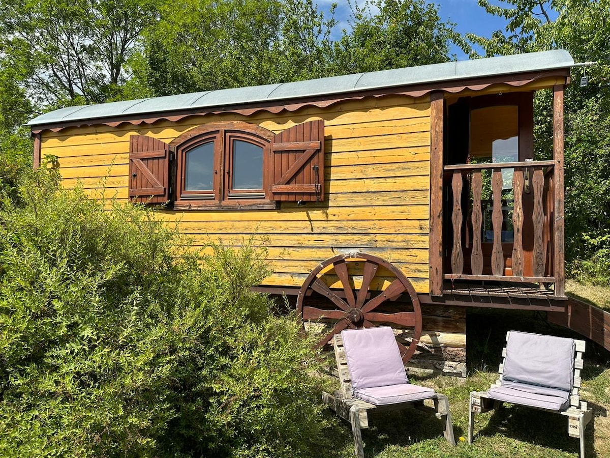 "Au Petit Bonheur", meðalstór sjálfstæð hjólhýsi, búin og smekklega skreytt..Það mun tæla þig ef þú ert ástfanginn af náttúrunni og ró. The advantage of camping but private... double bed, bathroom, toilet... Only condition: be 1,80m maximum! ....Sjónvarp, þráðlaust net...lítið eldhús: örbylgjuofn, 2 gaseldar,lítill ísskápur, kaffivél,diskar...Rúmföt og handklæði. Yfirbyggð verönd.. garður með sólbekkjum og grilli ( viður og kol fylgja),... aðgengi að sundlaug...!