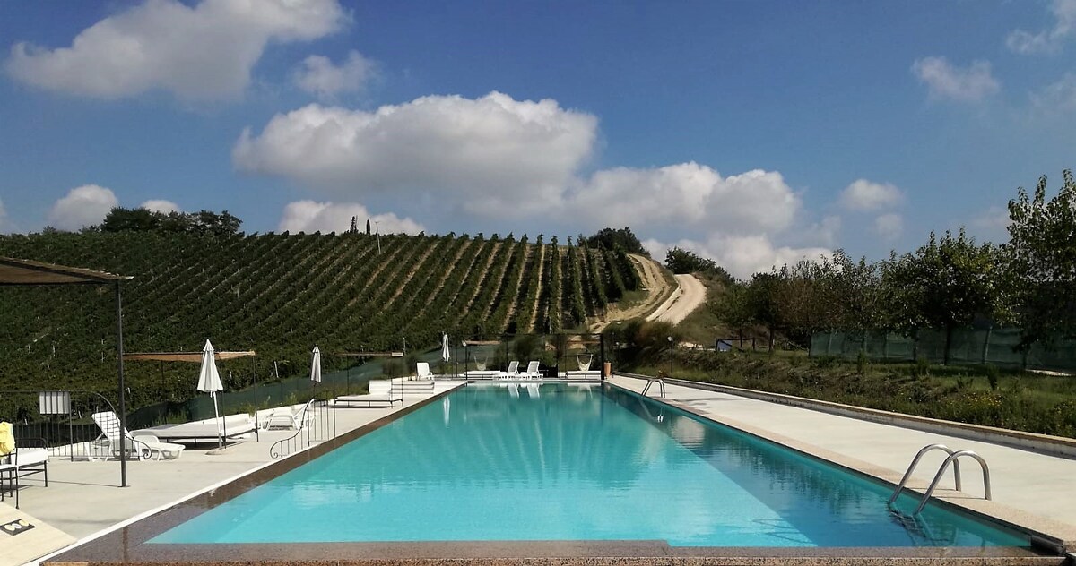 Regina íbúð Agriturismo Terre Vineate samanstendur af stórri stofu með eldhúskrók, tveimur svefnherbergjum með baðherbergi inni. Herbergin tvö eru með loftkælingu. Úti er lítill einkagarður úr tré. Gestir geta nýtt sér sameignina eins og miðlæga veröndina með útsýni yfir Sibillini-fjöllin, sundlaugina, leiksvæði barnanna og kjallarann. Við hlökkum til að sjá þig!!