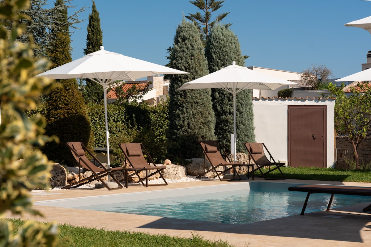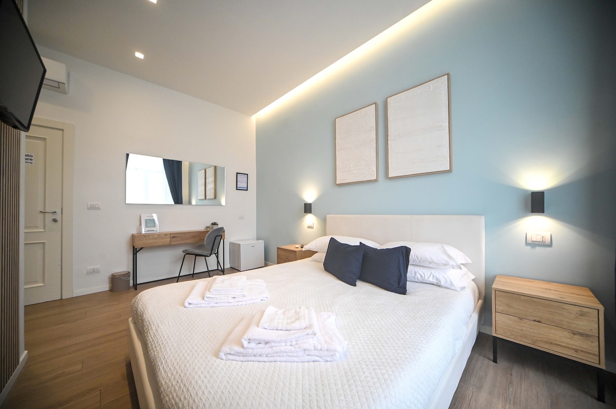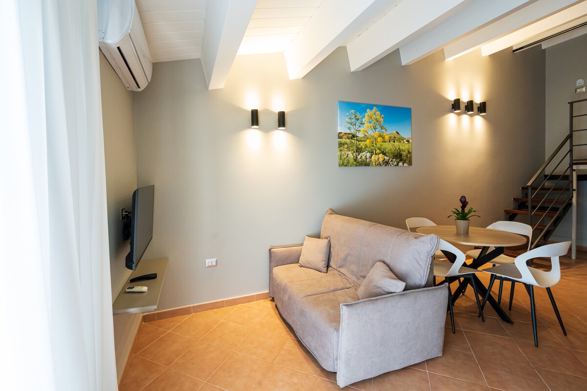 Í hvítum og bláum tónum er herbergið búið hjónarúmi með memory foam dýnu og rúmfötum , sérbaðherbergi og baðmull, barrými með stólum og sófaborði fyrir morgunverð. Möguleiki á víni og prosecco. Innréttuð með hefðbundnum Apúlískum Miðjarðarhafsstíl lætur þér líða vel. Fyrir utan herbergið er einkaverönd með innréttingum utandyra umkringd aldagömlum ólífutrjám og innfæddum plöntum.