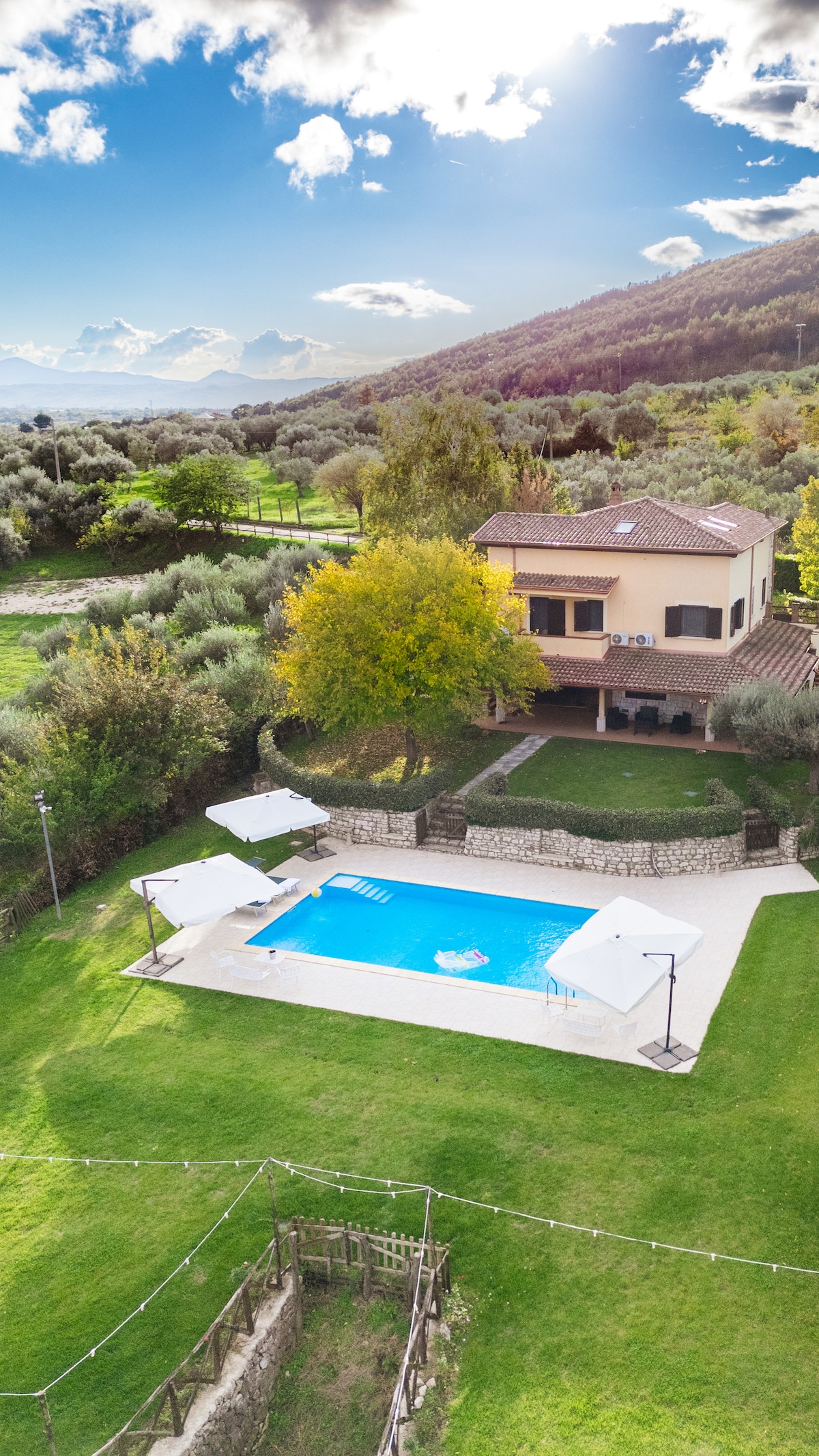 Villa Santoro ai Tre Ulivi is an exclusive retreat nestled in the hills of Caiazzo (CE), offering panoramic views over the Telesina Valley and the Matese mountains. The villa features a 12×6 panoramic swimming pool, solarium, BBQ area and spacious outdoor spaces. Spread over 3 levels with independent, air-conditioned apartments, it offers total privacy and is ideal for families, groups, events and team building. Strategically located to visit Caserta, Naples, Pompeii and the Amalfi Coast.