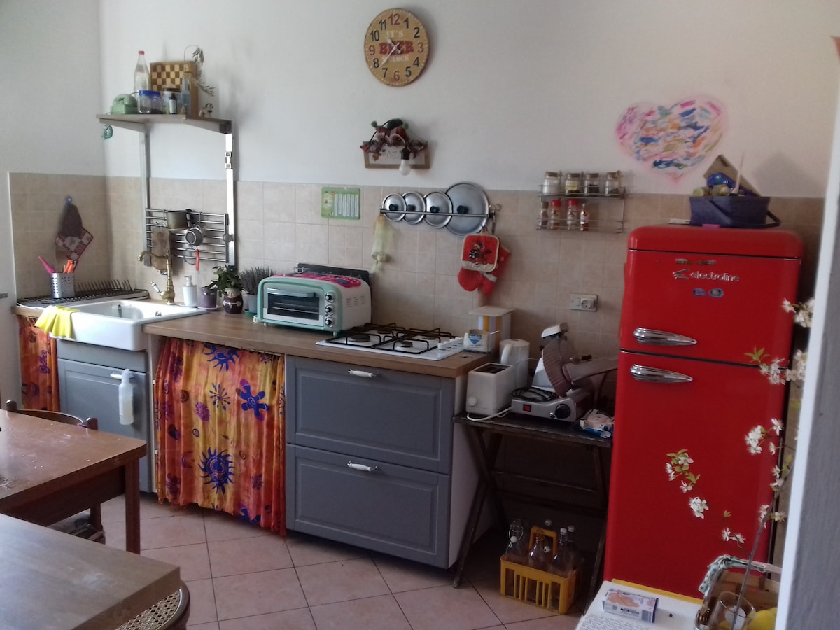 Þú verður í 36 fermetra nauðsynlegu og litríku umhverfi með afgirtum einkagarði með útsýni yfir lund. 800m frá Biella-Piazzo, efri og forna hlutanum sem tengist Biella-plano með „ströndum“ steinlögðum. 300m bus 360 to Oropa, Bottalino stop; 3 km frá stöðinni (strætó 330). Þetta er rólegt svæði þar sem fjölskyldur búa, hentugt sem bækistöð til að heimsækja borgina, ganga um Biellesi Prealps eða snúa aftur frá Camino d 'Oropa. Ókeypis bílastæði fyrir framan húsið. Skrifaðu mér fyrir hvaða beiðni sem er! :)