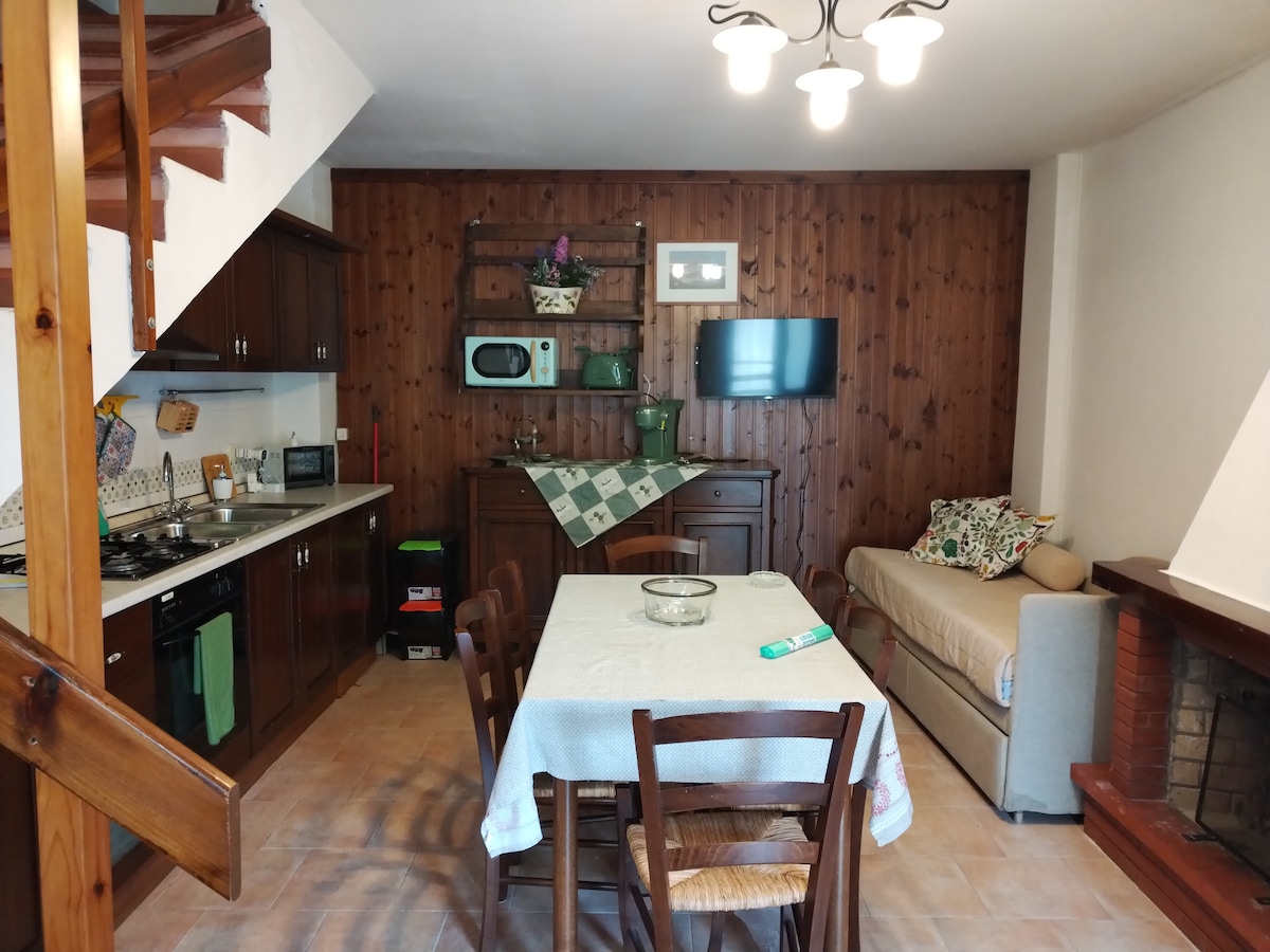 Caratteristica casa di montagna modesta e accogliente dove il calore del camino ti avvolge in un'atmosfera rilassante per goderti una vacanza confortevole in coppia o in famiglia. Provvista di biancheria da letto e da bagno, dotata di cucina attrezzata, divano letto e camino. Una scala in cotto porta al piano superiore dove si trova il bagno, la cameretta con letto a castello e la camera matrimoniale. La casa è situata in un parco privato dotato di parcheggio. A pochi minuti dal centro.