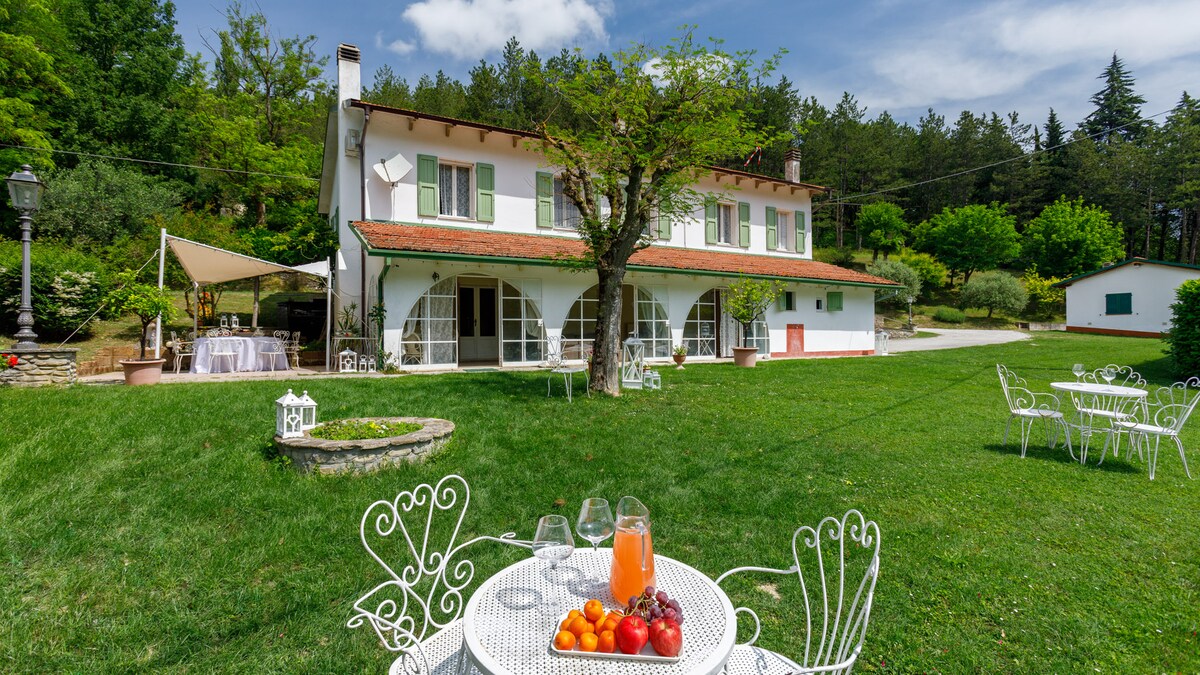 Villan er leigð út í heild sinni til einkanota. Það er umkringt náttúru Apennines og býður upp á fjölhæfan garð með sundlaug, tennisvelli og líkamsræktarstöð. Eldhúsið með útsýni yfir stofuna og einkennandi veröndina gerir gestum kleift að fá sem mest út úr dvöl sinni á öllum árstíðum. Bílastæði innandyra. Þráðlaust net. Stórt grillsvæði.