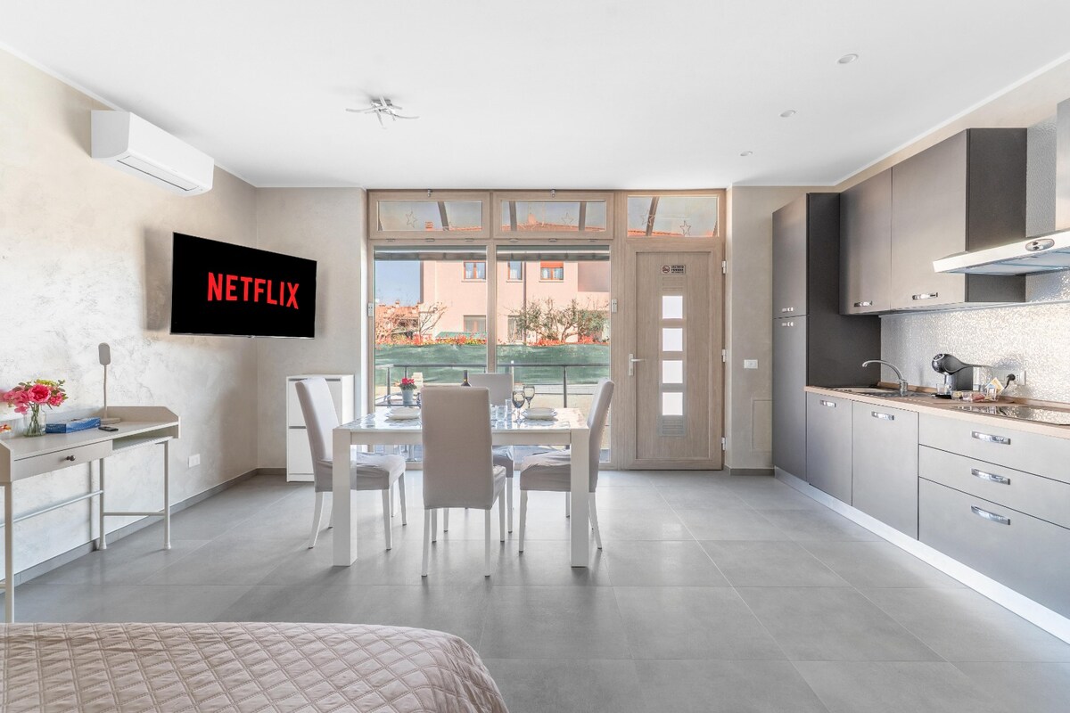 Fágað, bjart stúdíóíbúð sem er staðsett inni í villu en með sjálfstæðum aðgangi, nýbyggð, tilvalin fyrir þægilega frí aðeins 10 mínútum frá Garda-vatni. Stóru og vel viðhöldnu rýmuna eru með vinnustöð, þráðlaust net, loftræstingu og upphitun. Fullbúið eldhús, nútímalegt baðherbergi með sturtu og þvottavél. Verönd og grillsvæði sem er sameiginlegt með annarri íbúð er í boði. Matvöruverslun í göngufæri, bílastæði innandyra.