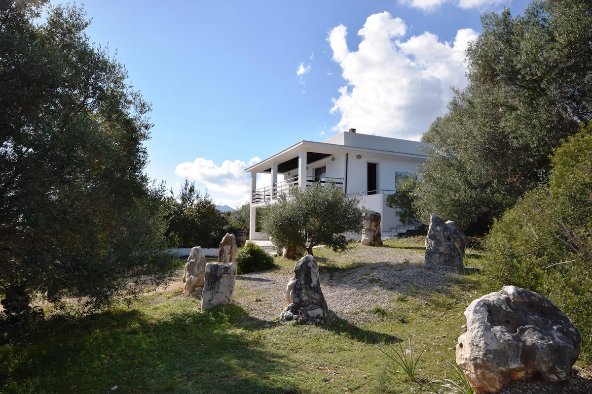 Hvítir veggir, minimalískur stíll og stórir gluggar. Stór veröndin er berskjölduð í austri með löngum sjóndeildarhring. Innanhúss með tveimur svefnherbergjum, baðherbergi með sturtu og eldhúsi. Úti með útisturtu, grilli og borði með marmarabekkjum gerir þér kleift að upplifa húsið jafnvel fyrir utan veggina. Húsið er 2,5 km frá ströndunum og 1 km frá þorpinu. Bíllinn er nauðsynlegur. Frábært fyrir 4-5 manna fjölskyldur.