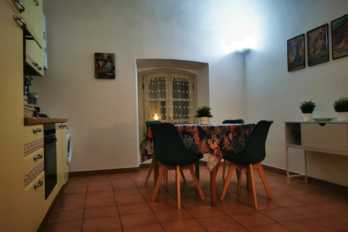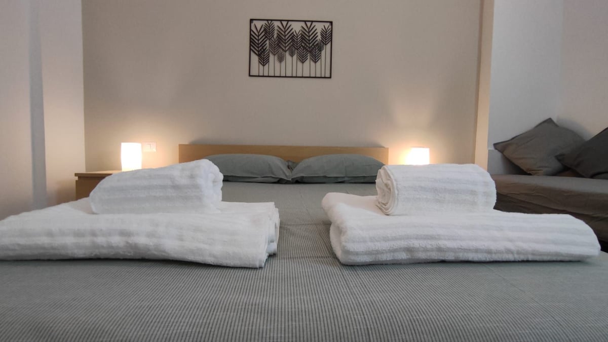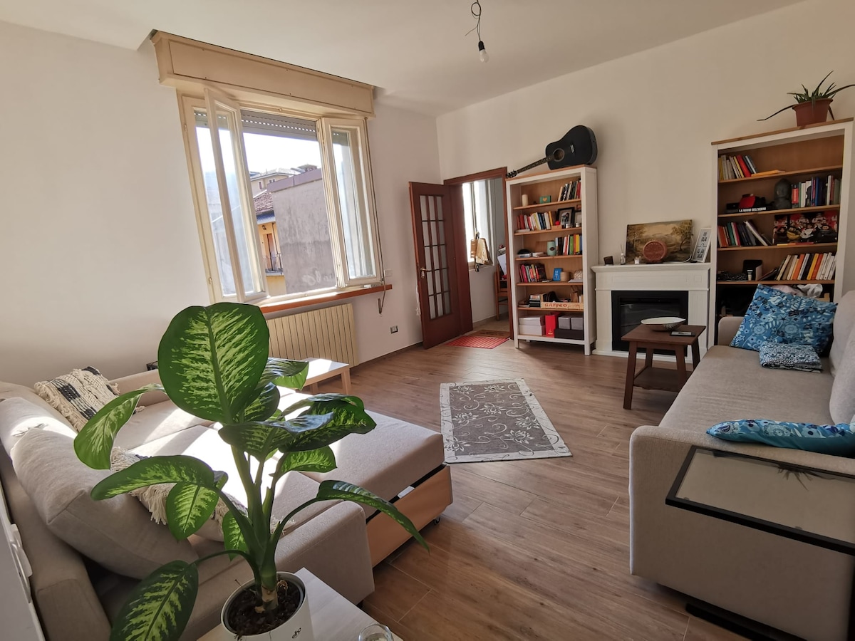 Luminoso ed ampio trilocale in centro storico a 200mt dall'ospedale e a 15' a piedi dalla stazione. Comprende: sala con due divani letto, TV, WI-FI, camino elettrico e libreria; Cucina completamente accessoriata, dotata di forno, frigorifero, freezer, lavastoviglie, piano cottura elettrico, macchinetta del caffè, piatti, stoviglie e utensili; Camera da letto matrimoniale; Camera con letto singolo trasformabile in matrimoniale e una scrivania con poltrona ergonomica. Parcheggio gratuito a 200mt.