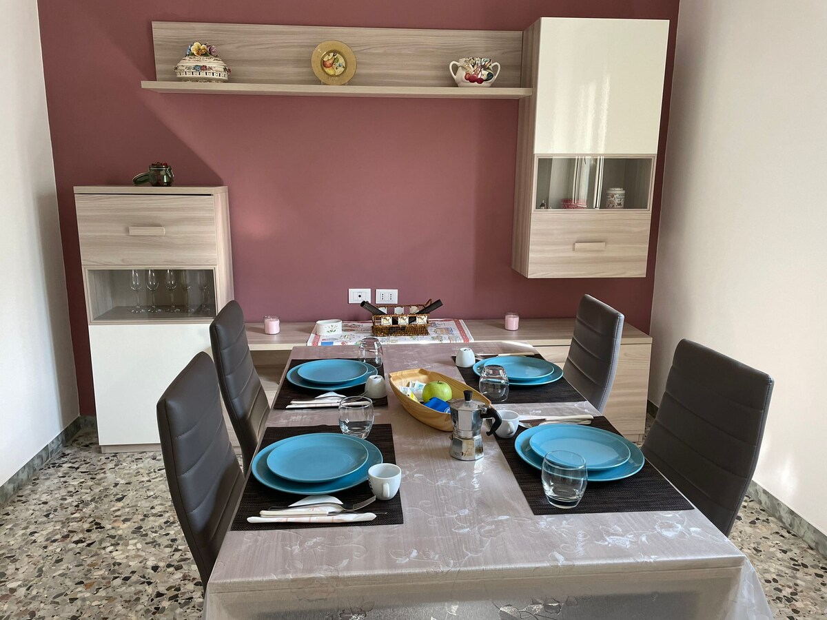 Luminosissimo appartamento con posto auto riservato in cortile interno. A 2 passi dalla stazione, dal centro, dal mare e dall'ospedale. Con una camera da letto, ampio bagno, cucina attrezzata, soggiorno con divano letto, tv e tavolo da pranzo, balcone. In un palazzo signorile, riservato e silenzioso al quarto piano con ascensore, con caldo parquet in tutta la casa. A disposizione degli ospiti lenzuola, asciugamani e set di cortesia con bagno doccia.