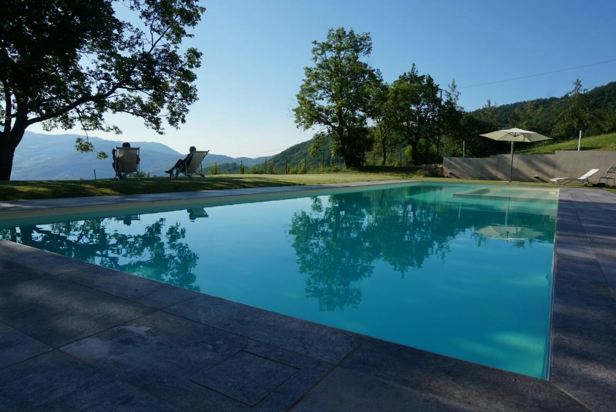 Stórt svefnherbergi með einkabaðherbergi. Eignin er með stórum garði og stórri sundlaug. Stór gestur deilir stofu þar sem þú getur eldað eða slakað á í stofunni. Við erum í hlíðum Parma milli Fornovo og Borgotaro ( konungsríki sveppanna). Staðsett 730 metra hátt á rólegum og yfirgripsmiklum stað. Nýlegar endurbætur virtu staðbundið efni og anda. Fjölskylduumhverfi. Það er tilvalið að slaka á og ná til Parma, Piacenza Modena, Cinque Terre.