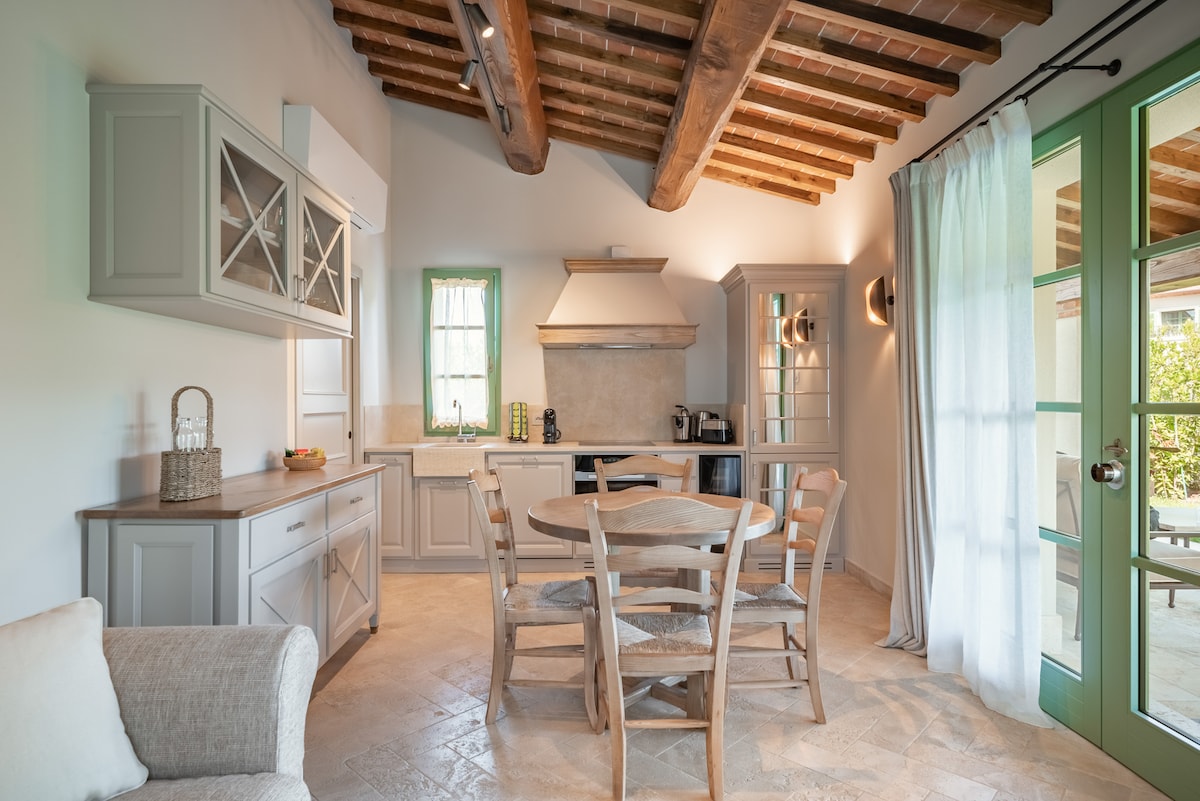 Lúxusíbúð sem er um 120 m2 með loftkælingu, einkaborðstofu utandyra með grill, 3 svefnherbergjum (2 tveggja manna og 1 með 2 einbreiðum rúmum), stofu með arineldsstæði, 3 baðherbergjum með sturtu, búnaðaríku eldhúsi, sjónvarpi og þráðlausu neti. Þægilegt fyrir 6 manns+1 barn í barnarúmi eða í svefnsófa í stofu. Íbúðin, innan dvalarstaðarins, býður gestum sínum upp á ókeypis bílastæði, útisundlaug, tennisvöll og sameiginlega þvottahús. Il Torrino er nálægt öllum mikilvægustu bæjum Toskana