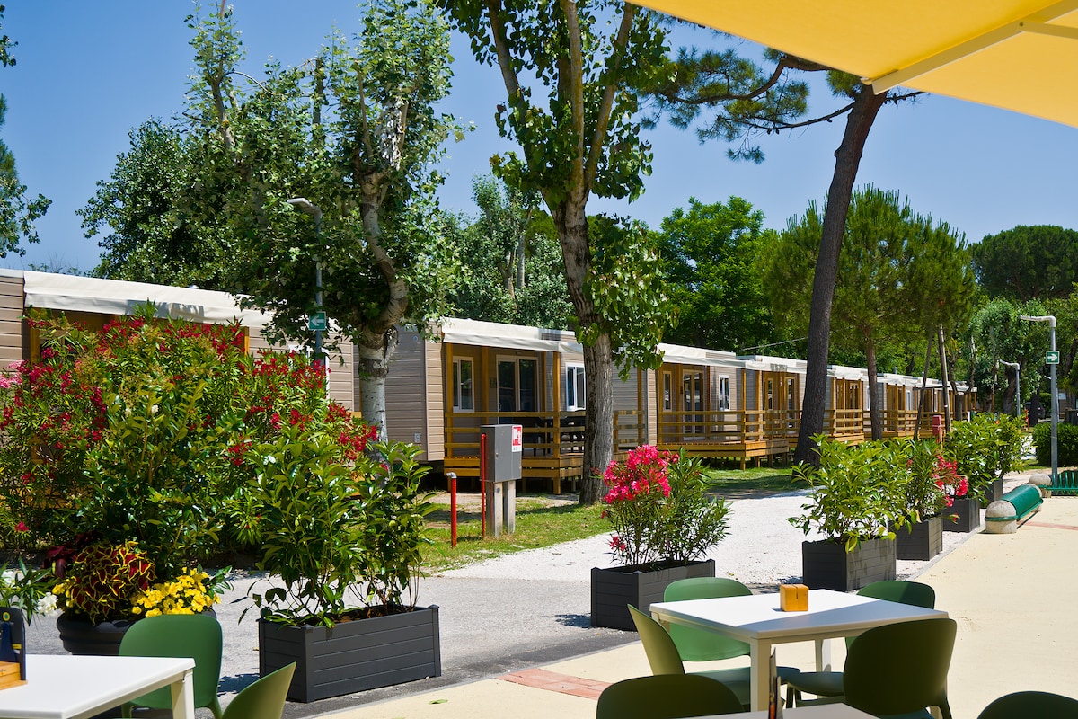 Posizionata a nord del campeggio sotto una folta pineta: la scelta ideale per la tua vacanza. -Animali ammessi -Veranda in legno con cancelletto e con tavolo e sedie da giardino -Soggiorno con angolo cottura attrezzato -Divano -1 camera matrimoniale -1 camera con 2 letti singoli (unibili alloccorrenza) -1 bagno con doccia, lavabo - WC separato -TV e A/C