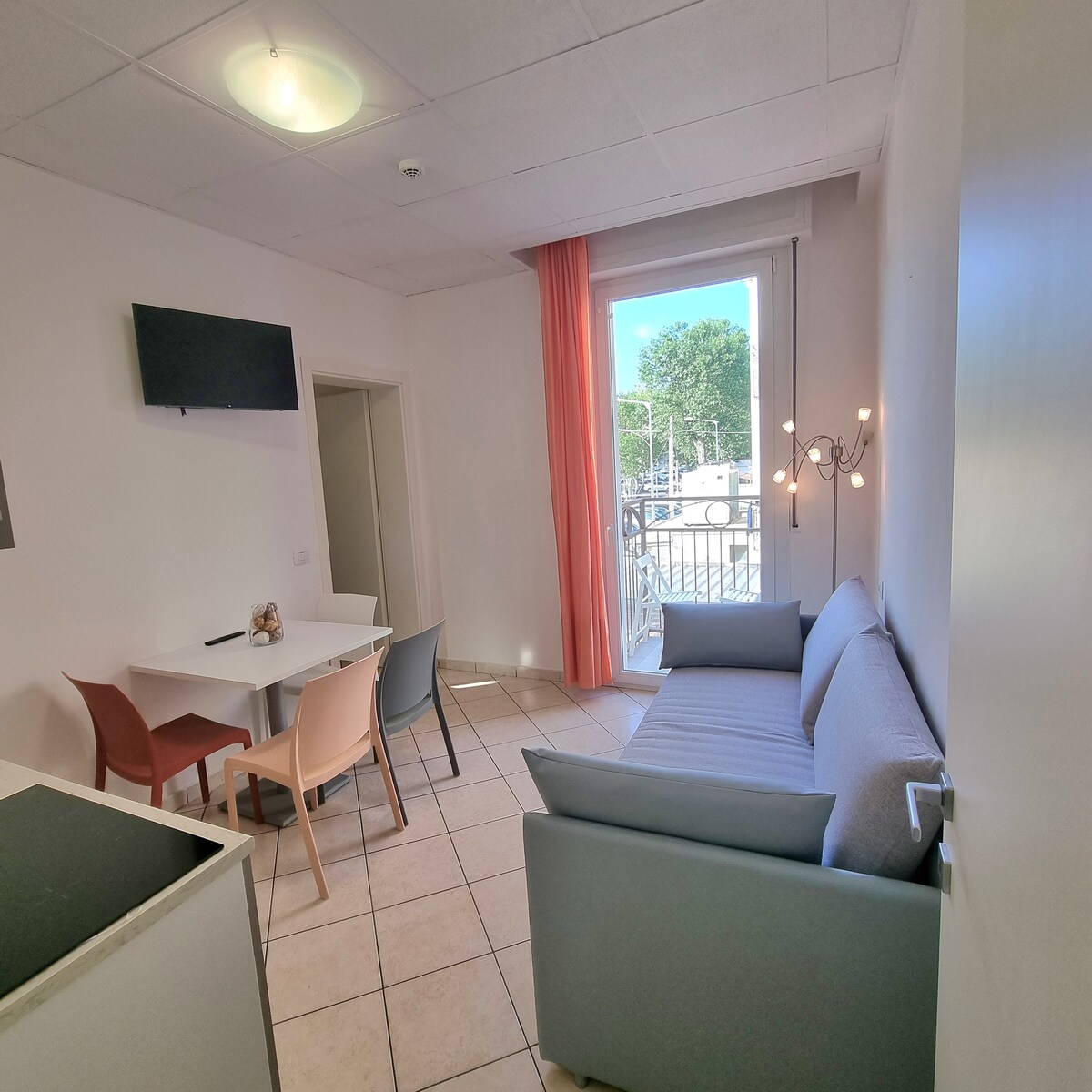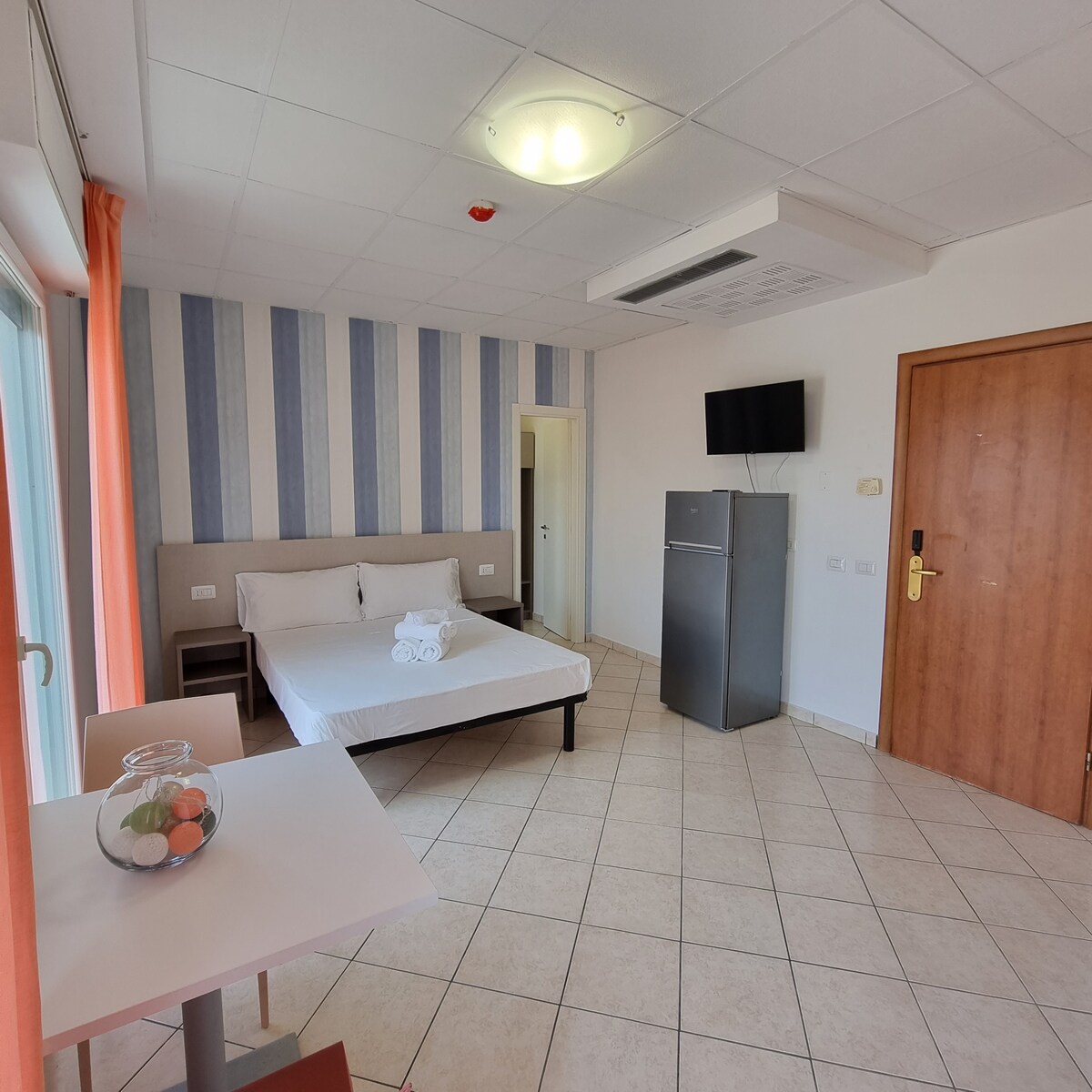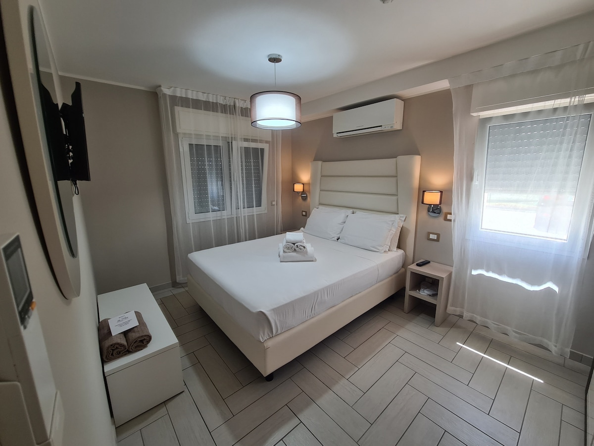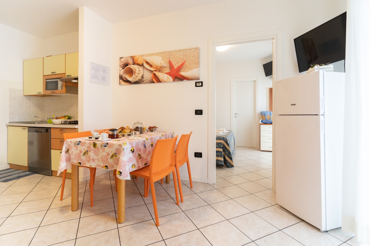 Frábær tveggja herbergja íbúð í lúxusbústað **** sem staðsett er í vin afslöppunar og vellíðunar milli Rimini og Riccione. Samsett úr stofu með sófa, borðstofuborði, fullbúnu eldhúsi og hjónaherbergi með Simmons Hotel dýnu fyrir 5 stjörnu hvíld og fullkomna þjónustu með sturtu. 10 fm svalir með borði fyrir 4 manns. Árstíðabundin sundlaug í boði + heilsulind gegn pöntun gegn gjaldi. Tilvalinn staður fyrir afslappandi frí. Ókeypis bílastæði.
