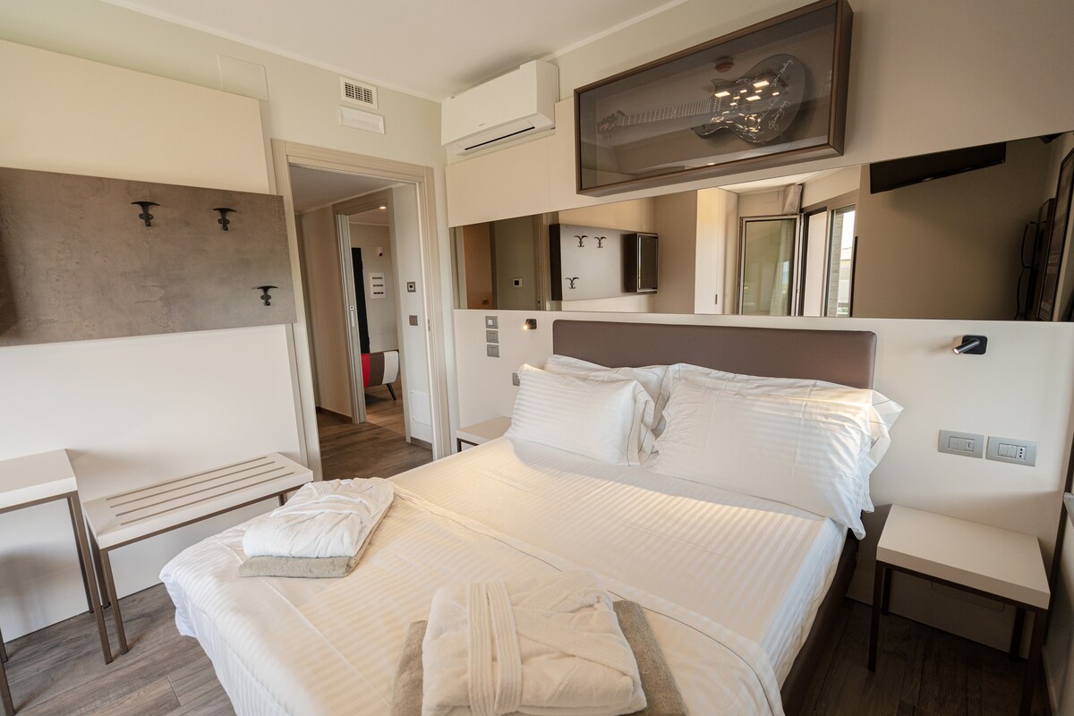 Ogni appartamento di Art Rock è unico e iconico, impreziosito da cimeli autentici della musica rock, dai Beatles agli Oasis, dai Queen ai Pink Floyd con vinili e chitarre autografate e opere uniche dell’ artista Elisa Vaccarini. L’appartamento 303 si sviluppa su due livelli, uno dei quali è un soppalco relax, in totale sono 85mq interni e 28 esterni di grande terrazza esterna. Può ospitare fino ad un massimo di 4 persone ed è composto da un’ampia zona giorno, 2 camere da letto e da 2 bagni.