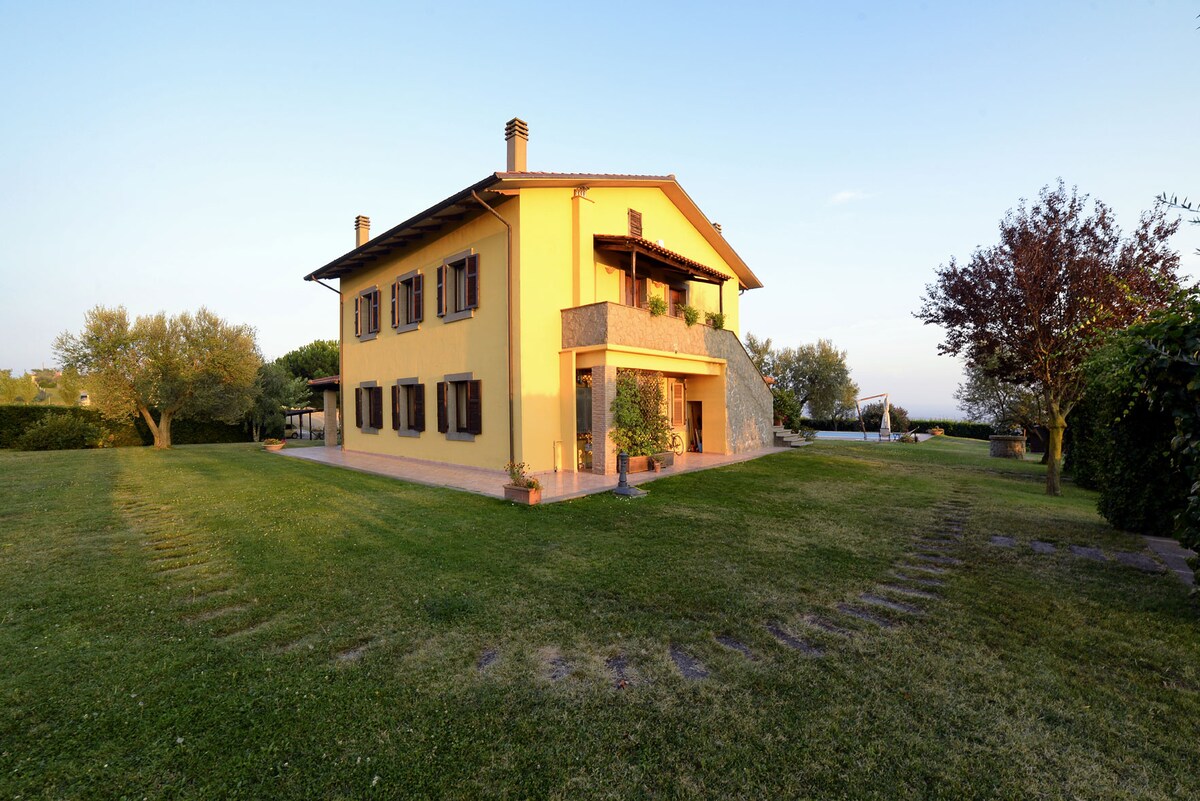 Einstök steinvilla með nútímalegri hönnun, umkringd gróðri innan um aldagamlar eikur og falleg ólífutré. Sundlaugin, sem er upphituð frá apríl til nóvember, með stórri sólstofu með útsýni yfir grillhornið með barborði, gerir þér kleift að eyða afslappandi dögum og einstökum stundum. Eignin er í nokkur hundruð metra fjarlægð frá Tuscia Terme hitagarðinum, í 5 mínútna fjarlægð frá miðaldahverfinu Viterbo og Terme dei Papi. Öll þjónusta og rými eru til einkanota fyrir gesti.