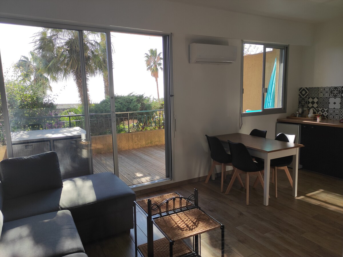 Appartement privé 2** avec entrée indépendante et un accès direct à la mer situé dans le sud à Solenzara : Appartement climatisé de 50 m2 Une pièce de vie une cuisine équipée avec lave linge et lave vaiselle donnant sur un coin repas et un salon avec canapé équipé d'une télévision. Une chambre : 1 lit Queen size 160 cm et 1 lit 90 cm (le linge de lit non fournit ) Une salle de bain avec douche et une terrasse avec barbecue donnant sur la mer avec accès direct à une petite plage