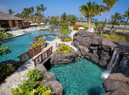 Lavish Lagoon-Style Pool Escape with Golf Views – Waikoloa Village Begin your morning on your private lanai, overlooking lush golf fairways. Explore lava-rock waterfalls and waterslides at the resort pool, then ride the shuttle to nearby Hilton Waikoloa Village. Finish your day with starlit BBQ.