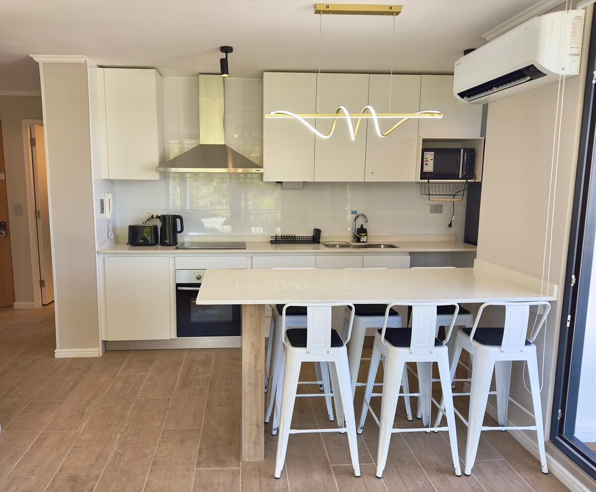 El departamento es como un refugio en la naturaleza de Pucón. Cuenta con todo lo necesario para tu descanso y relajo. 100% Equipado para 2 huéspedes: 🍽️ Cocina full equipada 🏋️ Gimnasio a libre disposición. ☕ Cafetera francesa y galletas biscoff 💻 Wifi y Smart TV 🏊 Piscina, disponible según temporada 👾 Sala de juegos 💡 Atención personalizada y recomendaciones locales Queremos ofrecerte una estadía ✨ 5 estrellas ✨ y que disfrutes al máximo tu estadía con nosotros!