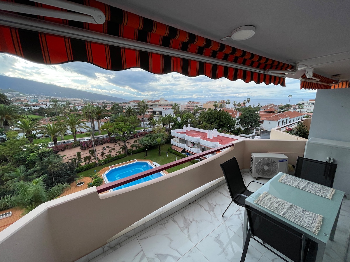 Innréttingar með hitabeltisinnblæstri, mjög björt og nútímaleg tómleg leiga á 8. hæð. Bókstaflega innan 30 sekúndna frá ströndinni. Í samræmi við stórkostlegt sjávarútsýni og frábært útsýni yfir Teide eldfjallið frá svölum með húsgögnum. Frábært stúdíó með 1 hjónarúmi og 1 svefnsófa. Þvottavél, þráðlaust net með ljósleiðara (600Mbps). Nálægt öllum þægindum, þar á meðal sólarhringsþjónustu í sal, tennisvelli, 2 háhýsi með sundlaug, 1 stór sundlaug og líkamsrækt utandyra.