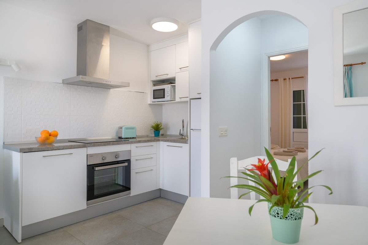 Íbúð alveg endurnýjuð fyrir framan sundlaugina með fallegu stíl, þú munt finna allt sem þú þarft til að njóta nokkurra daga hvíld, LOFTKÆLING, uppþvottavél, örbylgjuofn, ofn, þvottavél, Netflix, WiFi osfrv. Einka þéttbýlismyndun nálægt helstu þjónustu bæjarins (rúta, leigubílar, veitingastaðir, matvöruverslanir, strönd). Ströndin er í um 10 mín göngufjarlægð og verslunarmiðstöð með helstu verslunum um 5 mín.