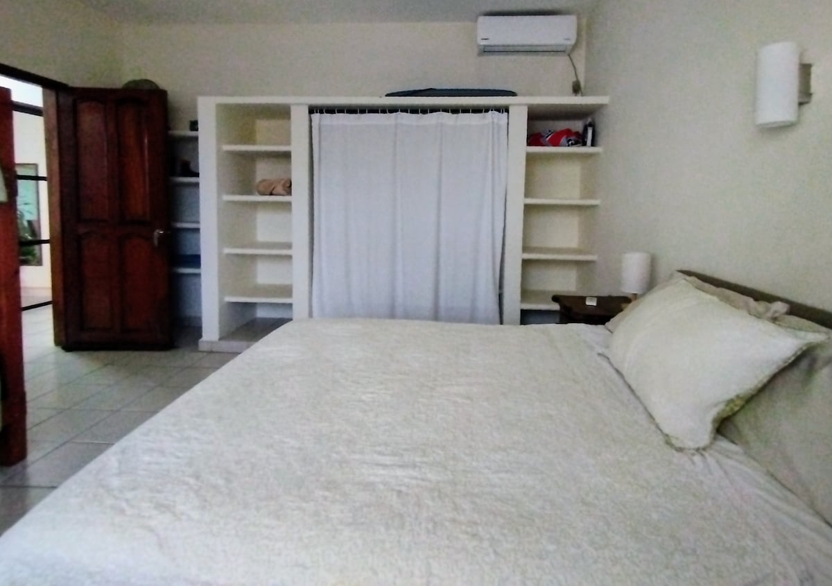 Komdu og njóttu nýhannaðs herbergis í 10 mín göngufjarlægð frá ströndum La Punta eða Zicatela. Herbergi með eldhúskrók, góðu king-rúmi og notalegu svæði til að slaka á. Íbúðin er staðsett undir húsinu okkar. Garðurinn er sameiginlegur með okkur en við komum aðallega þangað til að vökva plönturnar. Ströndin er í 10 mínútna göngufjarlægð frá eigninni okkar. Það er markaður sem heitir Mercado Zicatela þar sem þú getur fengið ferskt grænmeti á mánudögum og föstudögum í aðeins 10 mín göngufjarlægð.