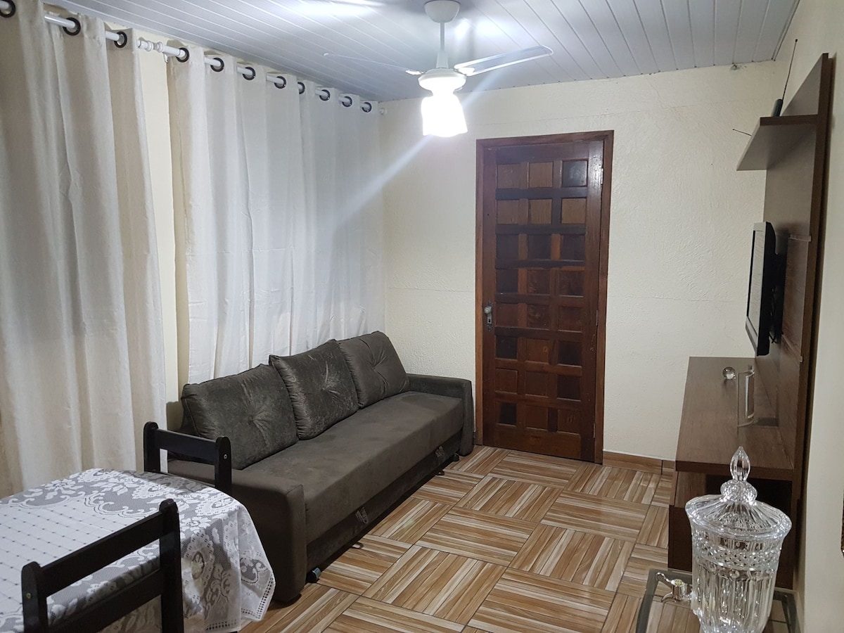Casa com conforto para sua família e seus amigos. Casa possui: Um quarto, com ar-condicionado, contem duas camas uma de casal e uma de solteiro, e claro, temos armadores para rede no hall de entrada. Sala com ventilador de teto, sofá, televisor com tv programação local. Cozinha equipada: Fogão, geladeira, Microondas e demais utensílios Banheiro equipado, box e chuveiro quente. Estacionamento fechado com garantia mínima de duas vagas. Acomoda confortavelmente até 4 pessoas.