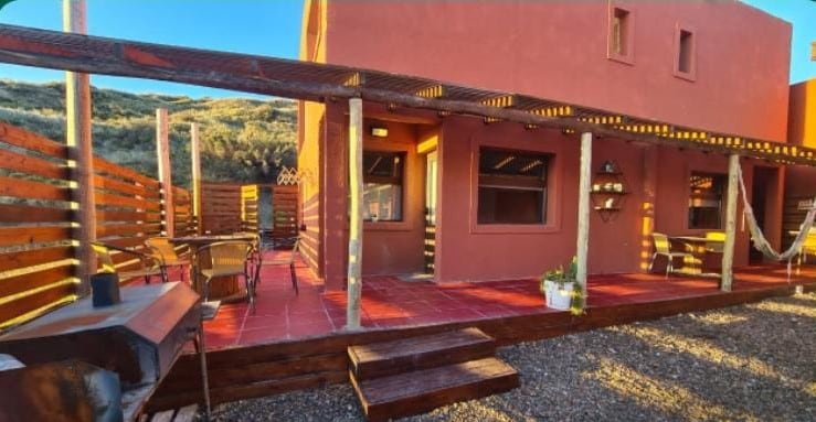 Sjálfstætt hús með garði og útsýni yfir hafið. Casa La Morada de Lola er fallegt strandhús. Með ótrúlegu útsýni yfir Puerto Pirámides-flóa. Inngangur hússins er stór garður. Hér er hálfklárað quincho þar sem hægt er að fá grill með útsýni yfir sjóinn. Fyrir aftan húsið er pallur með útsýni yfir sjóinn. Allt útbúið úti með garðhúsgögnum eins og stólum og borðum, hægindastólum og hengirúmi.