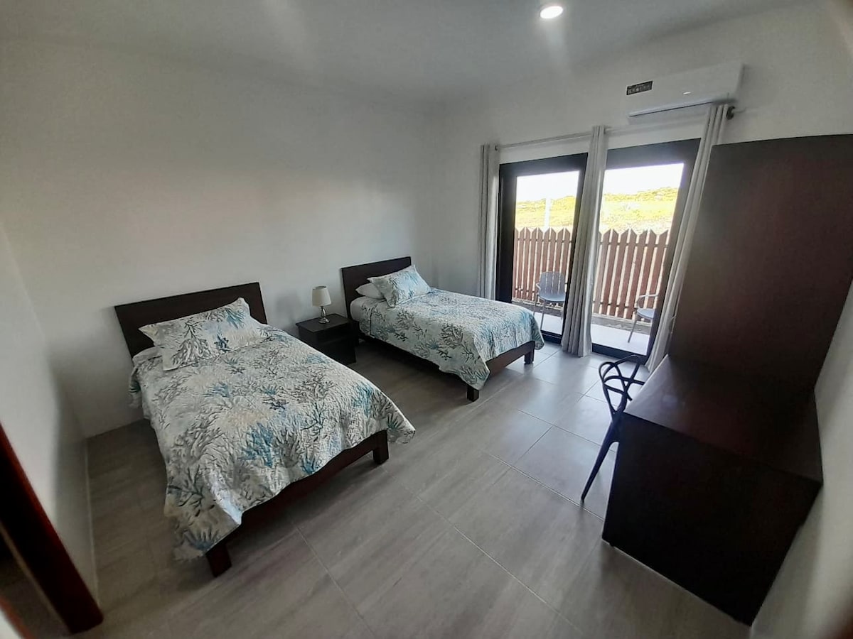 Fullbúin miðsvæðis svíta á 2. hæð. Fullbúið eldhús Sérinngangur með stafrænum lás Svalir með sjávarútsýni og útsýni yfir lónið. Fataskápasvæði Almennur þvottur fyrir alla gesti (sameiginlegt rými) Þvotta- og þurrkvélar + handþvottasvæði. Starlink Internet og aðgangspunktar á allri eigninni (inni og úti) svo að þú missir aldrei tenginguna. Heitt vatn með sólarplötum Reserve osmosis potable water in the flat and in the outside general chilling area.