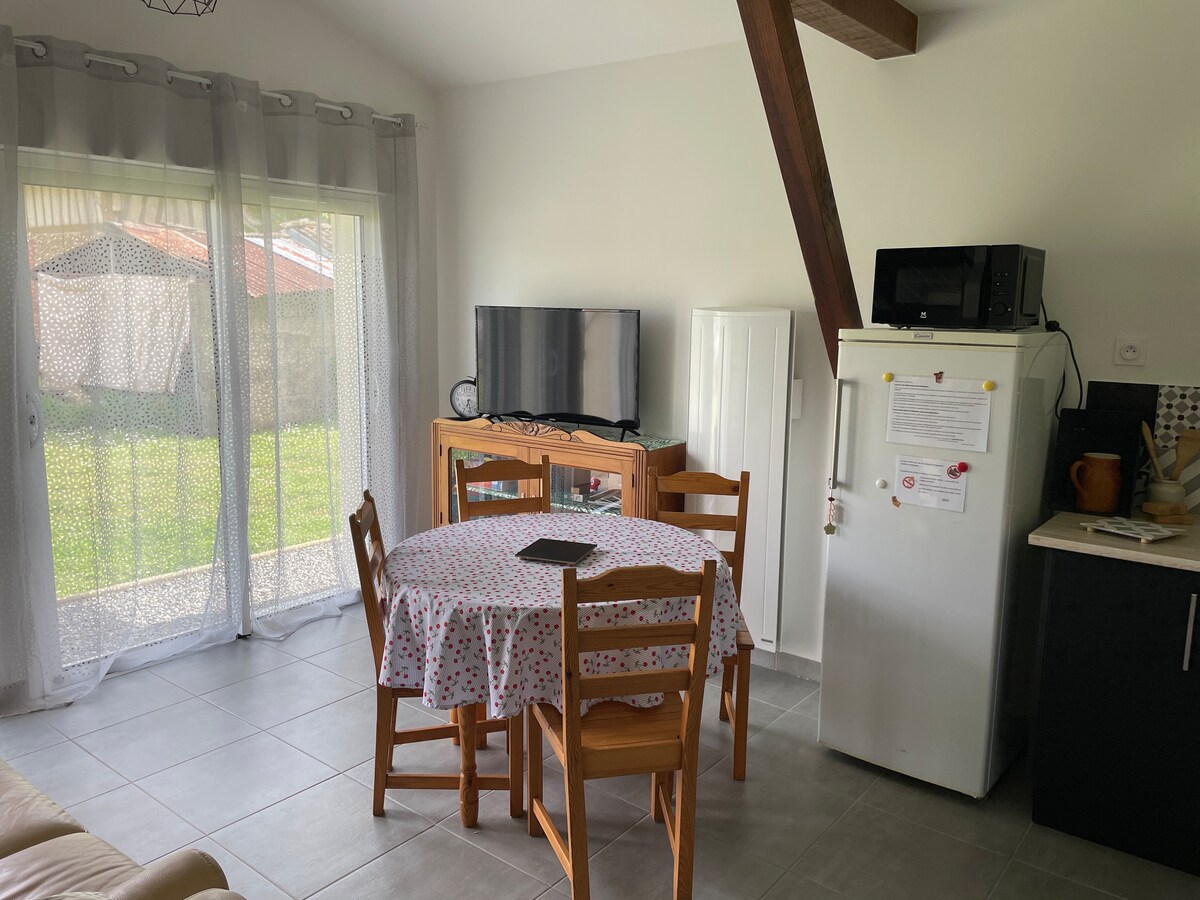 T2 42 m2 classé 3 étoiles Pièce principale : Canapé convertible, cuisine équipée, télé. Sale d'eau : douche à l'italienne - machine à laver chambre : lit 160 armoire si lit supp : 15€ par nuitée par personne En cas de lit suppl non prévu lors de la réservation, il est impératif de demander à l'hôte pour le canapé et le linge. Logement mitoyen sans vis à vis . Patio Jardinet non clos devant Arrivée autonome possible Commerces à 2 km