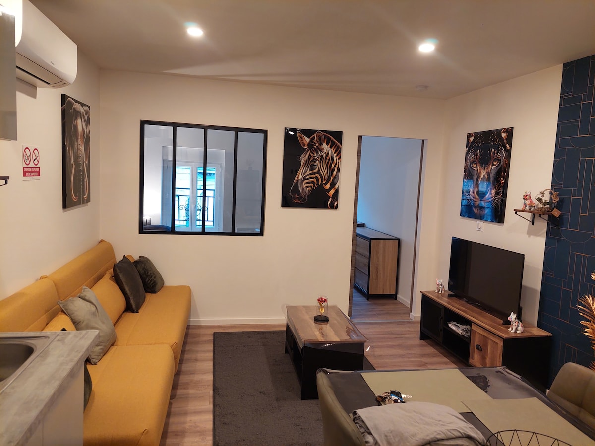 Íbúð á jarðhæð í aðalhúsinu okkar, í friðsælu hverfi. Frábært fyrir afslappandi eða faglega dvöl. Njóttu notalegrar stofu, útbúins eldhúss og þægilegs svefnherbergis með tengdu sjónvarpi. Þú ert einnig með einkaútisvæði. Nálægt verslunum og samgöngum á rólegu svæði. Þráðlaust net, loftræsting sem hægt er að snúa við og sjálfsinnritun er innifalin. Rúmföt eru til staðar (rúmföt, handklæði). Ókeypis og auðvelt að leggja