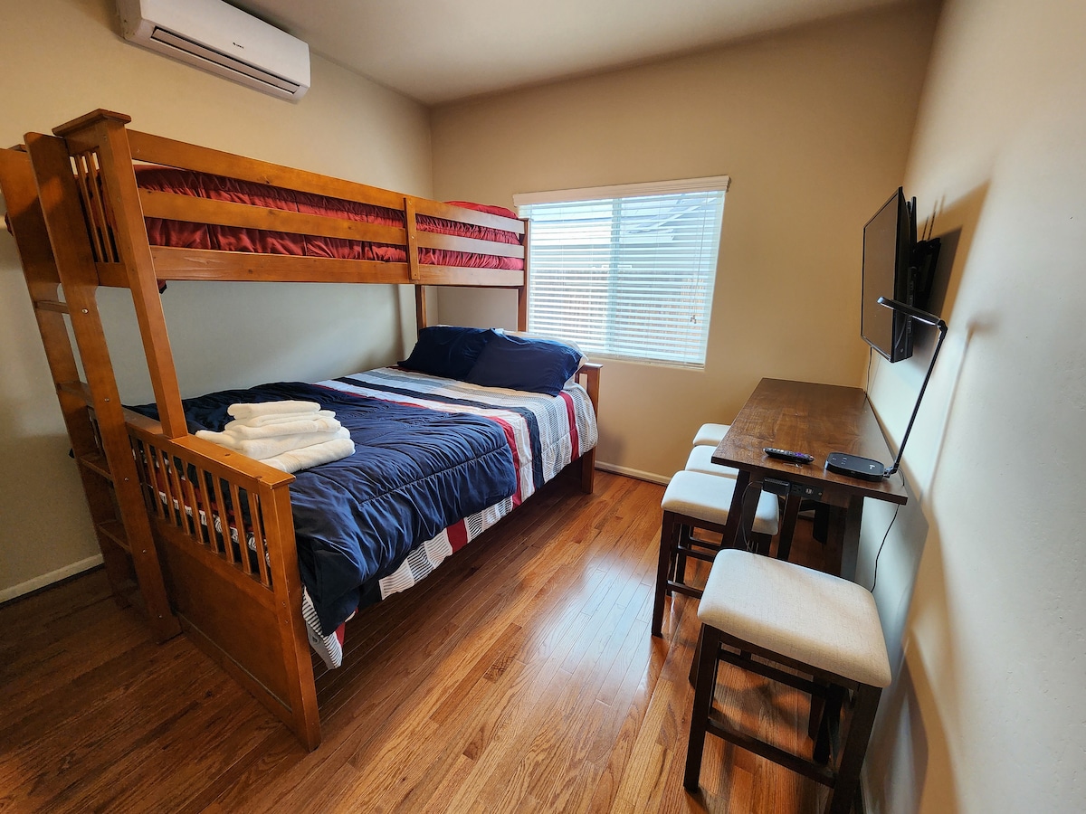 Þetta notalega einkastúdíó er algjörlega aðskilið frá aðalheimilinu og veitir þér friðsælt og sjálfstætt andrúmsloft. Þú finnur (1) Queen-rúm, þægilegt fúton, skrifborð og borðstofuborð sem hentar bæði fyrir afslöppun og afkastagetu. Njóttu afþreyingar innan seilingar með sjónvarpi og Xbox. Inniheldur einkabaðherbergi með nútímalegri sturtu sem tryggir þægindi og næði. Örbylgjuofn, lítill ísskápur og kaffivél eru til staðar sem gerir þér kleift að njóta uppáhaldssnakksins og drykkjanna