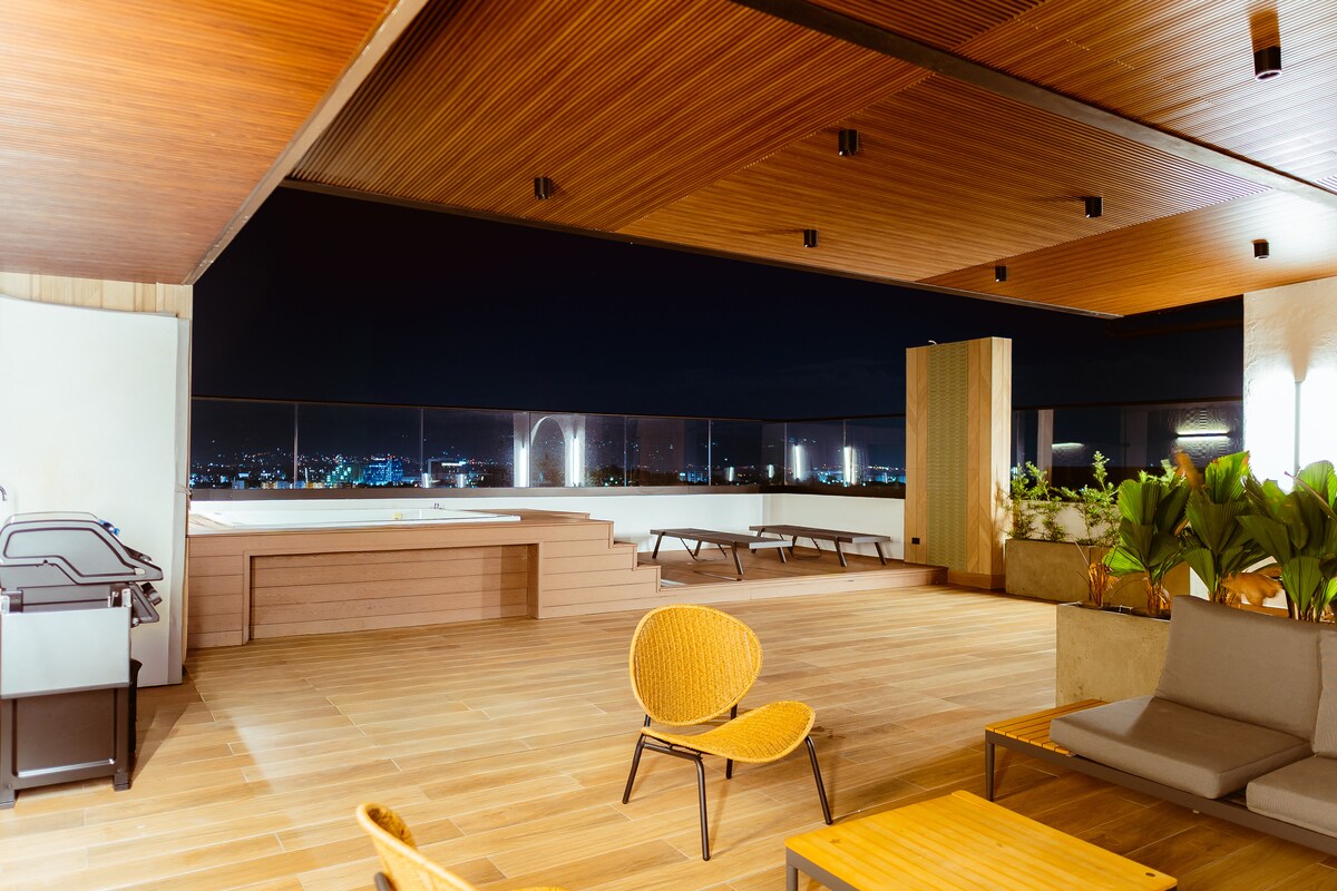 Njóttu Santiago frá rúmri lúxusíbúð sem hentar fullkomlega fyrir frí eða vinnuferðir. Slakaðu á í nuddpottinum með víðáttumiklu útsýni, sofðu vel með loftkælingu í öllum herbergjum og eldaðu í fullbúnu eldhúsi. Staðsett nálægt Ágora-verslunarmiðstöðinni, flugvellinum, HOMS-sjúkrahúsinu, veitingastöðum og aðalvegum. Þægindi, næði og hreinlæti í hæsta gæðaflokki fyrir fimm stjörnu dvöl. Fullkomið fyrir pör, fjölskyldur og stjórnendur.