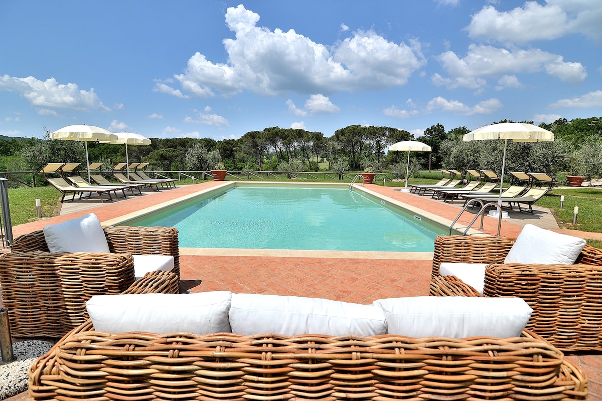 Öll efri hæðin í nýuppgerðri Villa Padronale í hefðbundnum Toskana stíl. Hátt til lofts með sýnilegum geislum gera það notalegt og fullkomið fyrir fjölskyldur eða vinahópa. Í húsinu eru tveir hagnýtir stórir arnar(í stofunni og eldhúsinu). Einkagisting, ekki sameiginleg. Húsið er með stóra yfirbyggða verönd,garð með sófum,bbq,eldstæði, einkabílastæði. Sundlaugin meðal ólífutrjánna og vínekranna er tilvalin til að slaka á og hefur einkaaðgang að sameiginlegu svæði