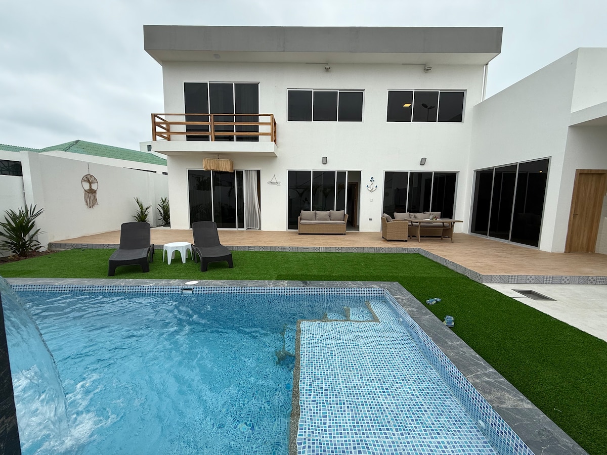 Great resort like home! Pool with a Slide and volley ball net, Jacuzzi, ocean front, with plenty of spaces for relaxing and enjoying the beach weather. This complete home has very spacious living areas and play room. Internet works great and in a pieceful area. The pictures speak for the home. The beach is calm and water is safe for swimmers. We have chairs and tent for the sun. The guard will be able to help you with all details of your stay.