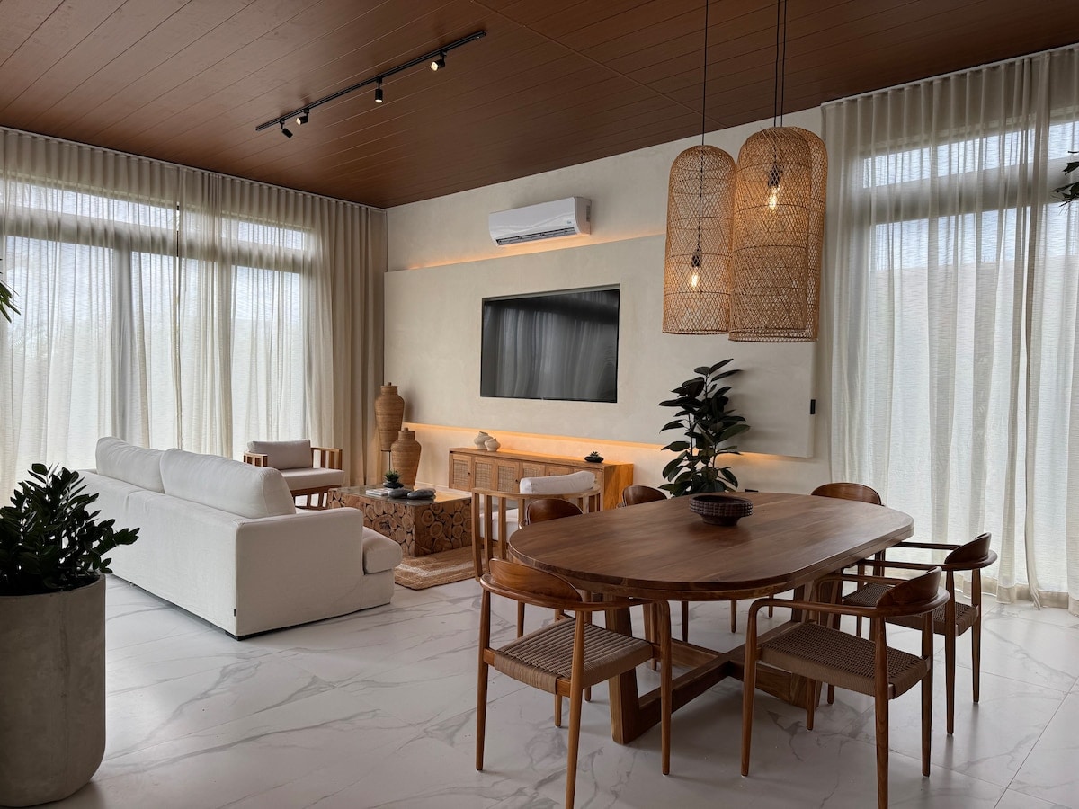 Glæný 6 herbergja nútímaleg villa með stórri saltlaug í íburðarmiklu hverfi við hlið Punta Cana Village. Umkringt strandklúbbum í innan við 10 til 30 mínútna akstursfjarlægð. Þú getur gengið að frægri veitingahúsaræmu í þorpinu. Stór matvöruverslun Navional er í 5 mínútna fjarlægð. Í 6 mínútna fjarlægð frá flugvellinum. Þrif á virkum dögum frá Kemberly þernu okkar eru innifalin í verði. Ólíkt öðrum villum rukkum við ekki aukalega fyrir rafmagn en biðjum um að slökkva á loftræstingu þegar þess er ekki þörf.
