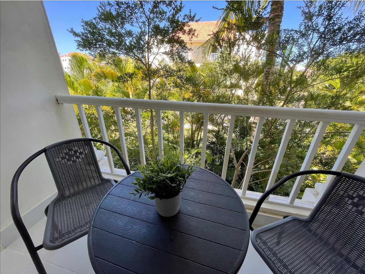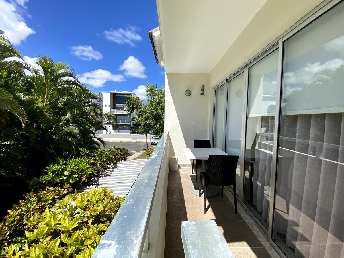 Verið velkomin á heimili þitt að heiman í hjarta Punta Cana Village! Þessi glæsilega íbúð með 1 svefnherbergi býður upp á fullkomna blöndu af þægindum, þægindum og hitabeltissjarma. Íbúðin er tilvalin fyrir ferðalanga sem eru einir á ferð, pör eða viðskiptaferðir og er með bjarta stofu undir berum himni, fullbúið eldhús, notalegt svefnherbergi með queen-size rúmi og nútímalegt baðherbergi. Stígðu út á einkasvalir til að njóta morgunkaffisins eða kvölddrykkjanna með friðsælu útsýni.