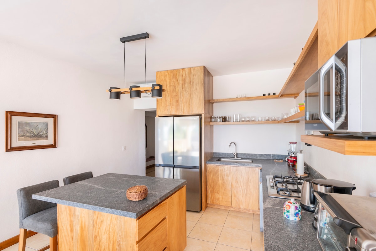 Stúdíó við ströndina með aðgengi að sundlaug og strönd. 5 mín frá Punta Mita og Higuera Blanca. 15 mínútur frá Sayulita og 30 mínútur frá Bucerias. 45 mín til alþjóðaflugvallarins án umferðar. Nálægt bestu brimbrettastöðunum í flóanum. Strönd sem lítur út eins og Karíbahafið í Kyrrahafinu, stórbrotið sólsetur og gott þráðlaust net. Fjölskylduvænt og gæludýravænt. Þú getur ferðast til Marietas-eyja eða veitt frá nálægum þorpum eða La Marina de La Cruz de Huanacaxtle í 20 mínútna fjarlægð.