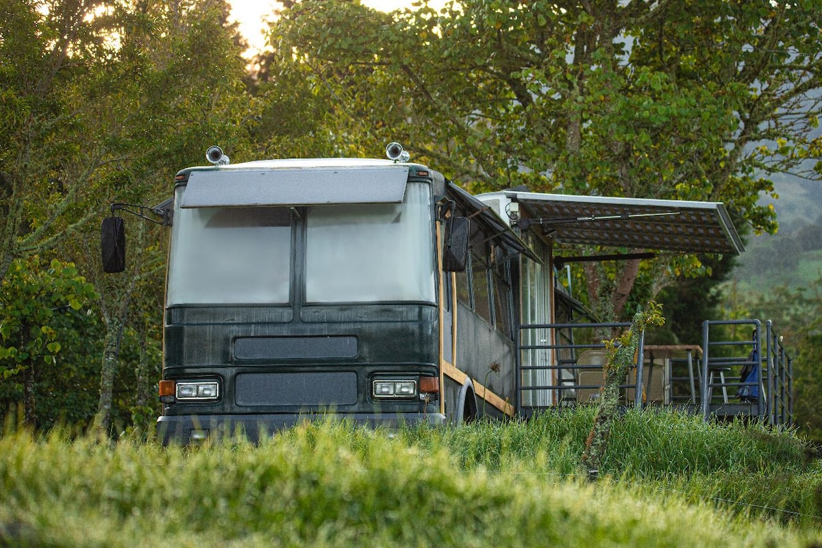 Við erum staðsett í Clouds of Coronado, mjög nálægt San José. Það er einstakt húsnæði, rúta breytt í fallegt lítið hús, í miðju fjallinu. Við erum með king-size rúm, tvo hægindastóla sem er breytt í hjónarúm, fullbúið eldhús, verönd með útsýni yfir fjallið og grill í miðjum garðinum. Og pláss til að búa til varðeld. Að auki geta gestir okkar nýtt sér alla aðstöðu Samaná Ranch.