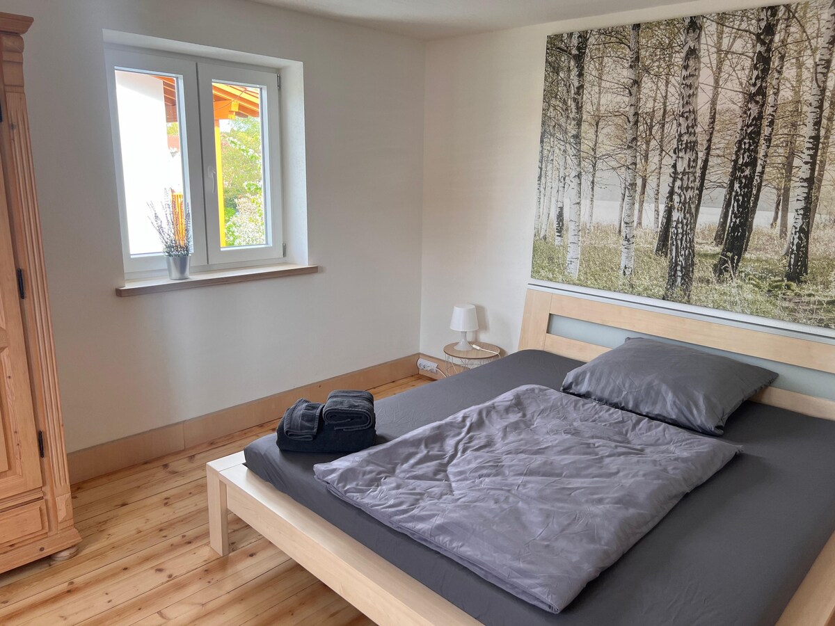 Notalega íbúðin okkar er staðsett á milli svæðisins við 5 vötnin og fjallsvæðisins. Það er frábær upphafspunktur fyrir gönguferðir í náttúrunni, hjól- eða mótorhjólsferðir, sundferðir og borgarferðir. Það býður upp á aðskilið svefnherbergi með stóru hjónarúmi. 2 svefnstaðir í viðbót eru í boði með þægilegum svefnsófa með dýnu. Í fullbúnu eldhúsi, borðstofu, stofu og á svölum geta gestir notið friðarins eftir skemmtilegar skoðunarferðir.