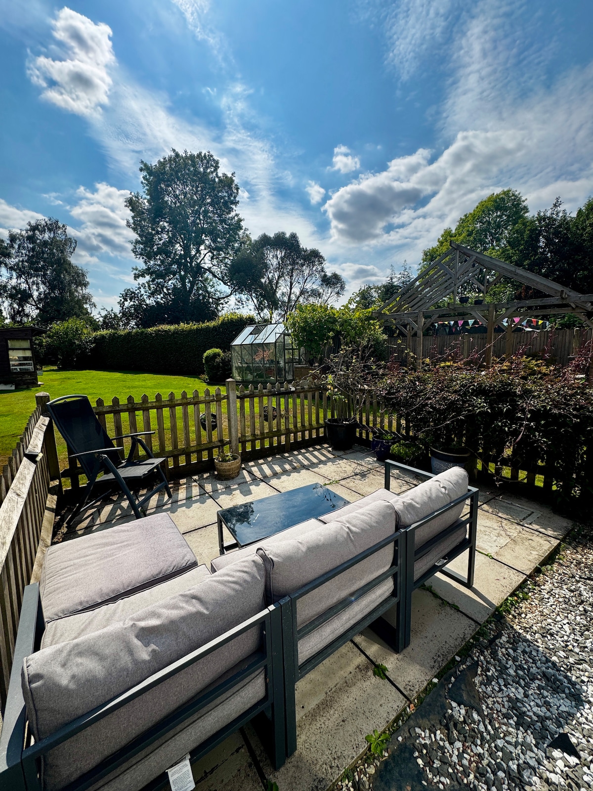 This beautiful Garden Lodge is set away from the main house, accessed via automatic gates within gated grounds. Fitted kitchen with all mod cons in a very large open plan living space. 2 very small bedrooms. Bedroom 1: 1 double bed. Bedroom 2: 1 double bed. Main Space: 1 double bed. Suitable for couples, families, solo guests, business travellers, and groups, sleeping up to 6 people. Also, useable for daytime business meetings, seminars and training sessions up to 12 people by application.