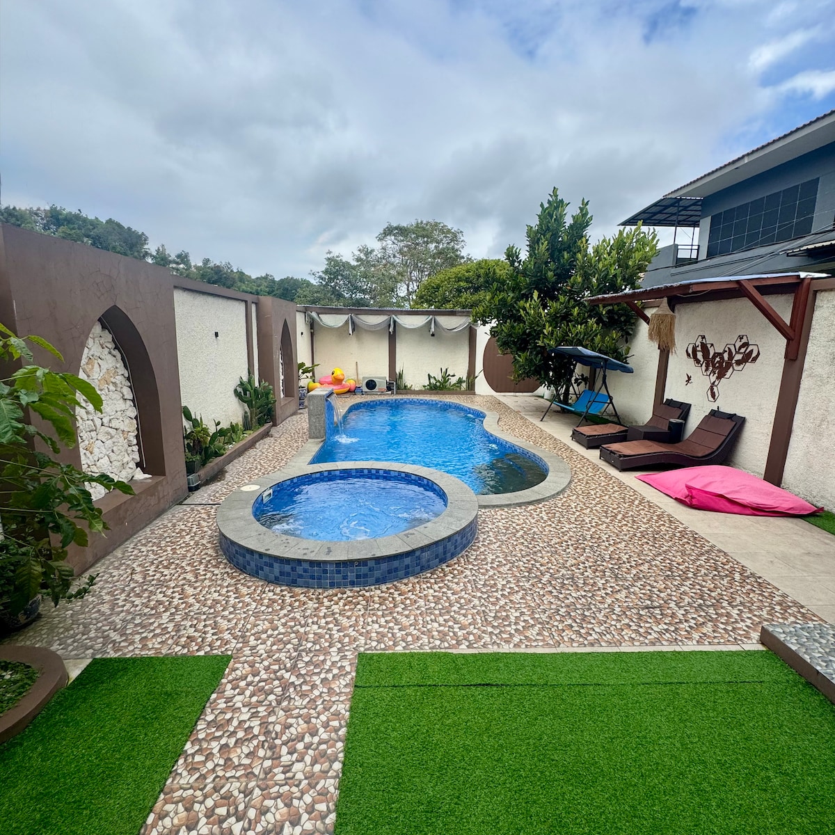 *forskriftir OG þægindi* 3 svefnherbergi ( 4 rúm í king-stærð ) + 2 svefnsófar 3 baðherbergi ( einka + vatnshitarar ) baðker einkalaug stofa ( sungken ) þráðlaust net Grill snjallsjónvarp karaókí sundlaug matsölustaður eldhús bílastæði ( 2 bílar ) ísskápur skammtari + ölkelduvatn örbylgjuofn hrísgrjónaeldavél Loftræsting ( öll herbergi) hnífapör og eldunaráhöld