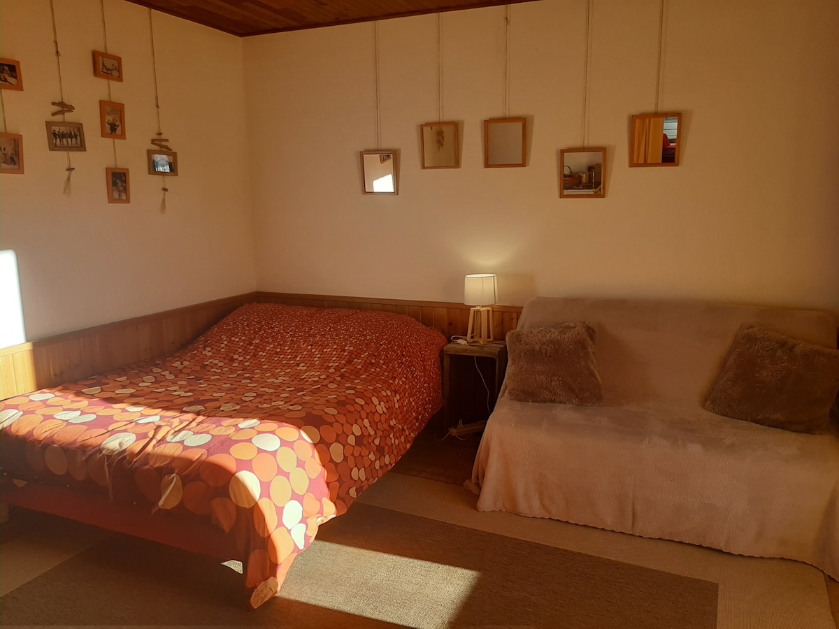 28 m2 íbúð hefur verið endurnýjuð að fullu á 1. hæð hússins okkar í rólegu hverfi með 18 m2 verönd sem snýr í suður og óhindruðu útsýni yfir fjöllin. 1 herbergi með eldhúskrók, stofa með sjónvarpi, þráðlaust net, svefnsófi, 1 svefnherbergi með hjónarúmi (140 x 190 cm) og tveimur kojum (90 x 190 cm). 1 baðherbergi með sturtu og salerni. Tilvalin gistiaðstaða fyrir tvo, möguleg fyrir allt að 4 manns. Bílastæði á einkabílastæði. 900 m frá miðborginni og lestarstöðinni.
