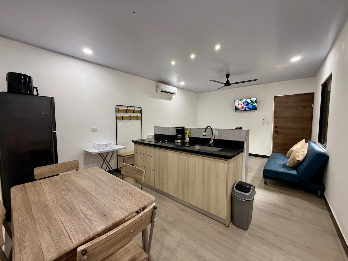 Jungle studio in a gated upscale community just 10 minutes to playa Mantas. Stúdíóið er á stærri eign með 15k metra hæð sem býður upp á mjög rólega, örugga og þægilega dvöl. Stúdíóið er undir aðalheimilinu okkar og er algjörlega sjálfstætt með yfirbyggðum bílastæðum á aflokaðri lóð okkar. Stúdíóið býður upp á sterkt ÞRÁÐLAUST NET, loftræstingu, lítið eldhús með eldavélarhellu og heitu vatni. Á svæðinu er mikil náttúra og við sjáum tuucan, lapas og apa. Einkaganga með sjó er á staðnum…. Þetta er ótrúlegt!