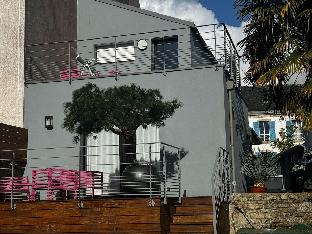 LE DELOS: Uppgötvaðu fallegu 45m² íbúðina okkar sem er í 100 m fjarlægð frá miðbæ Quimper. Þessi notalegi kokteill er tilvalinn fyrir rómantíska dvöl eða frí þar sem boðið er upp á öll nútímaþægindi í fáguðu og róandi umhverfi. Annað til að hafa í huga: • Háhraða, ótakmarkað þráðlaust net • Flatskjásjónvarp 165 cm + sjónvarp í herbergi • Rúmföt og handklæði fylgja • Kaffi og te • Einkabílastæði • Íbúð á jarðhæð • Fullbúið eldhús • Rúm 180x200