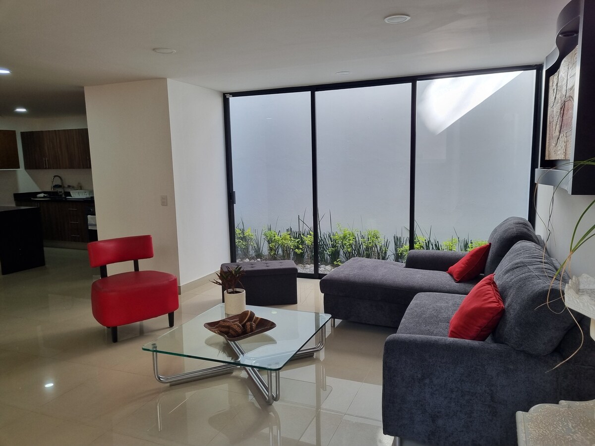 Bright, modern high-rise space on the 18th floor with open city views. Ideal for couples, friends, and relaxed longer stays. 3 Queen beds for up to 6 guests Equipped kitchen Large-capacity washer and dryer Electric blinds and high-speed Wi-Fi for home office Enjoy a 24/7 GYM, rooftop, and in-building parking for 2 cars Pet-friendly building with security service and 24/7 security cameras Quick access to Cholula, Angelópolis, and key attractions