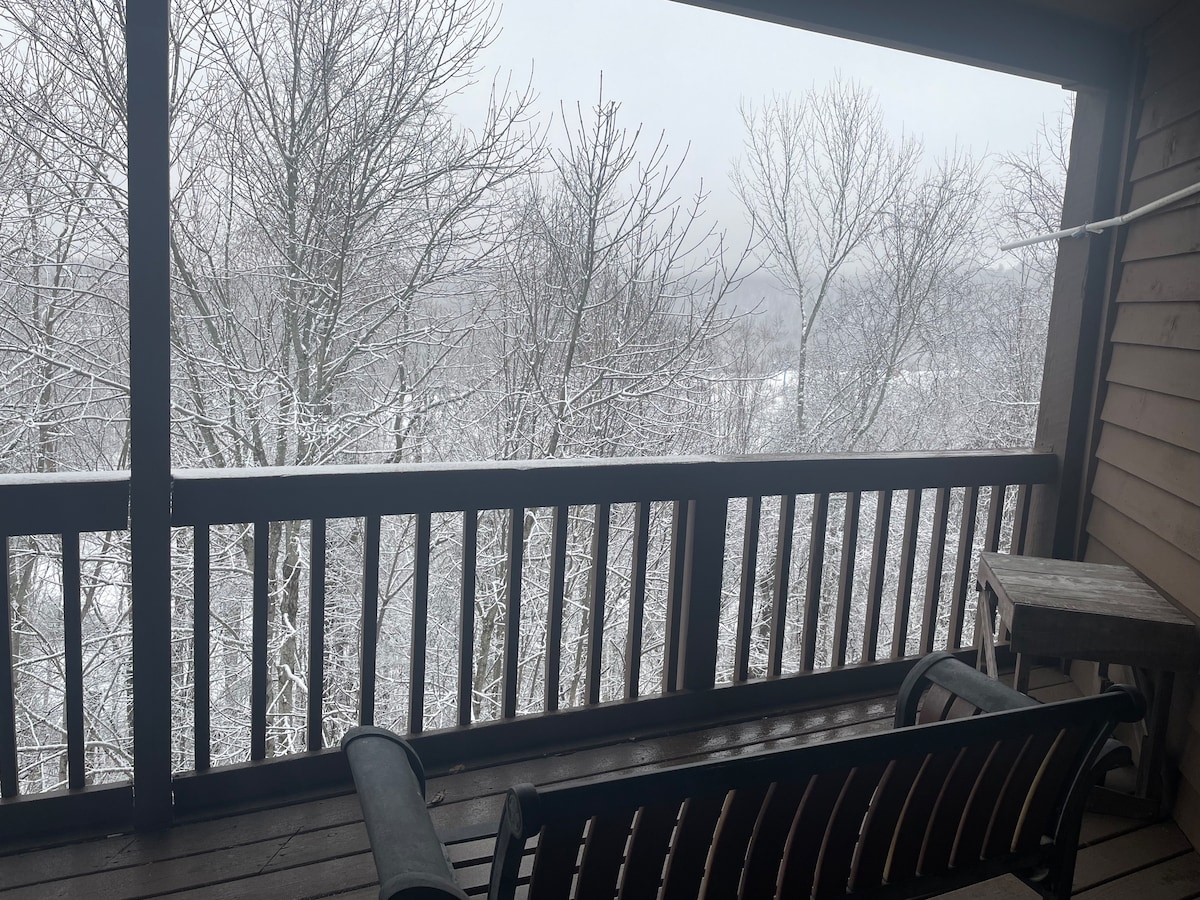 Farðu á skíðum út í brekkurnar á Winterplace-skíðasvæðinu. Það er staðsett á annarri hæð og svalirnar eru með útsýni yfir „Last Chance“ brekkuna. Íbúðin rúmar 10 manns með tveimur Queens, kojum og sófa. Í eldhúsinu eru nauðsynjar eins og kaffivél, pottar og pönnur, örbylgjuofn fyrir ofan, uppþvottavél og allt sem þarf fyrir dvölina. Í stofunni er rafmagnsarinn og útsýni út um rennihurðina út í brekkurnar. Handklæði eru til staðar.