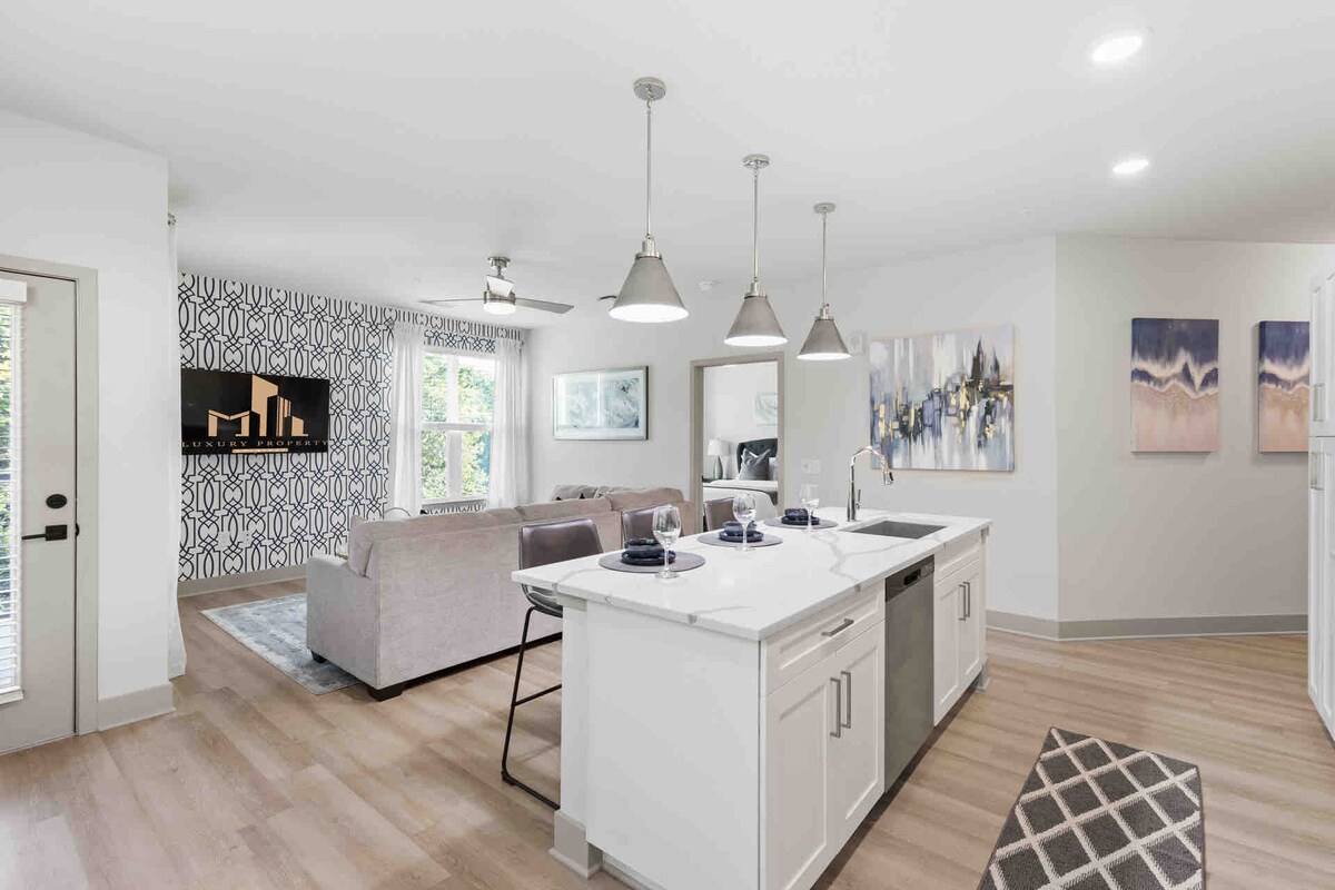 Slappaðu af í þessari glæsilegu tveggja svefnherbergja lúxusíbúð fyrir fyrirtæki. Nálægt sjúkrahúsum og miðborg Raleigh. Fullt af vinsælum veitingastöðum, kvikmyndahúsum, heilsulindum, verslunum, sögulegum kennileitum og áhugaverðum stöðum. Ævintýri í gegnum Raleigh og svæðið auðveldlega frá þessum besta stað. Slakaðu á innandyra með hönnunarinnréttingum, flatskjásjónvarpi og lúxusþægindum. ✔ Fullbúið eldhús ✔ Þægileg svefnherbergi með tveimur queen-size rúmum ✔ Opin hugmyndastofa ✔ Skrifborð ✔ Háhraða þráðlaust net ✔ Ókeypis bílastæði Frekari upplýsingar er að finna hér að neðan!