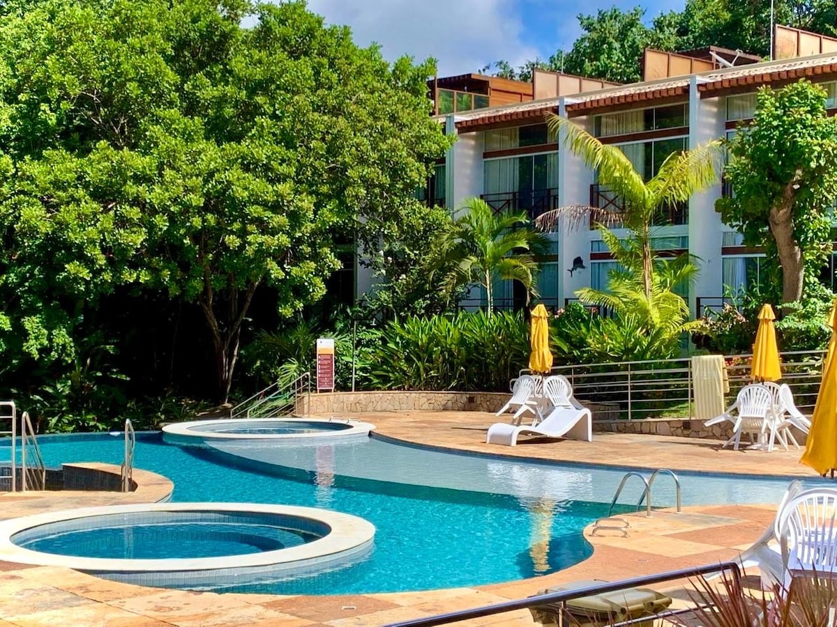 Þessi íbúð er með amerískri hugmynd með edrú og smekklegum innréttingum, þægileg og á góðum stað inni í Solar Águas, sem er fyrir framan Central-laugina, með stórum svölum og einstöku útsýni yfir stofuna, þar er stofa, borðstofa og eldhús í opinni hugmynd, einkaherbergi og loftkæling með tveimur tvíbreiðum rúmum og baðherbergi með skáp. Á eftirlaunum til að taka á móti fjölskyldu með allt að 4 einstaklingum eða pari sem er annt um þægindi einstaklinga.