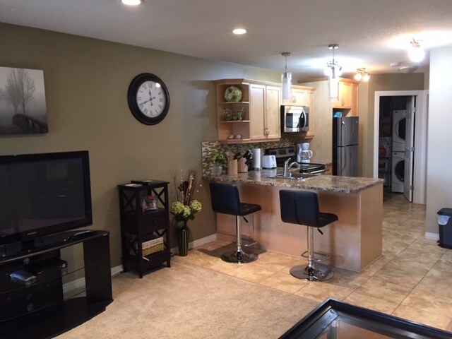The 2 bedroom fully furnished suite includes all utilities (cable and Wi-Fi too), en-suite laundry, towels/linen and plug in parking The suite is well appointed with furnings and the kitchen contains all the cookware. Við bjóðum upp á nóg af sundries (þvottaefni, pappírsvörum, sápum, ruslapokum og kaffi) til að sjá þig í gegnum fyrstu 2 vikurnar. Eastgate Bay er í frábæru hverfi sem er öruggt og líflegt með smásölu-/matvöruverslunum, veitingastöðum og göngustígum í nágrenninu.