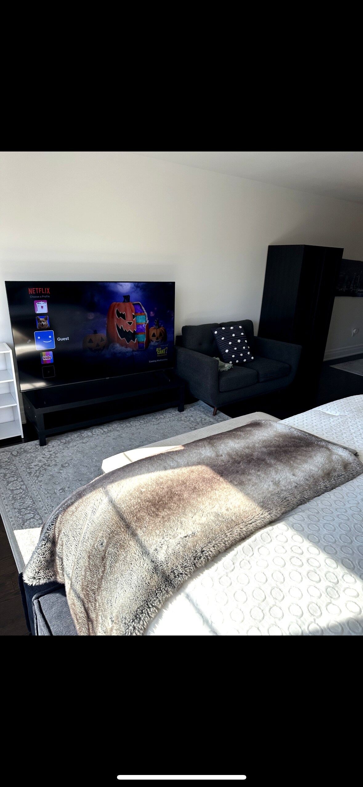 Welcome to your private loft retreat! Perfect for extended stays or business trips. • 🛏 Hotel Quality King Bed – fresh linens, beautyrest mattress a cozy setup for restful nights. • 📺 70” Smart TV – Netflix, Crave and streaming ready for movie nights. • 🍳 Kitchenette – with essentials (mini-fridge, microwave, stovetop, dishes) plus a dining table for two. • 🚿 Private Bathroom – modern, with fresh towels and shower essentials. • 🔐 Smart Entry – easy self check-in with secure keypad.