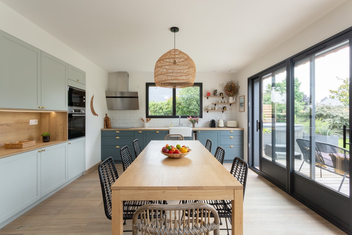 Þetta friðsæla heimili býður upp á afslappandi dvöl fyrir alla fjölskylduna. Í eigninni eru 2 svefnherbergi, stofueldhús sem er 36 fermetrar að stærð og eitt baðherbergi með sturtu. Hér er 10 m x 4 m sundlaug (upphituð frá 15. apríl til loka september) og nuddpottur (upphitaður allt árið um kring). Það er staðsett á 5000 metra lóð. Við erum 4 km frá sýningargarðinum og 4,2 km frá ker lann, 2,5 km frá flugvellinum og 9 km frá miðbæ Rennes . Rennes -Lorient hraðbrautin er í 2 km fjarlægð. 3 Golf í um 5 km fjarlægð.