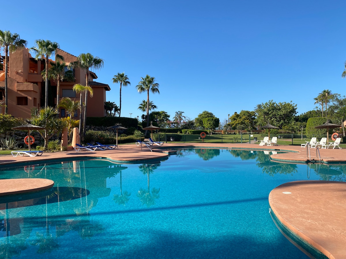 A one bedroom south facing Penthouse Apartment with panoramic views across the Mediterranean Sea. Located in a quiet, gated urbanisation with 24 hour security the luxury 1 bed Penthouse, is situated within sub tropical gardens and 10 minutes walk from the beach. Large contemporary lounge, kitchen and bathroom with sliding doors to a generous balcony with fabulous pool and sea views of Gibraltar and Africa!